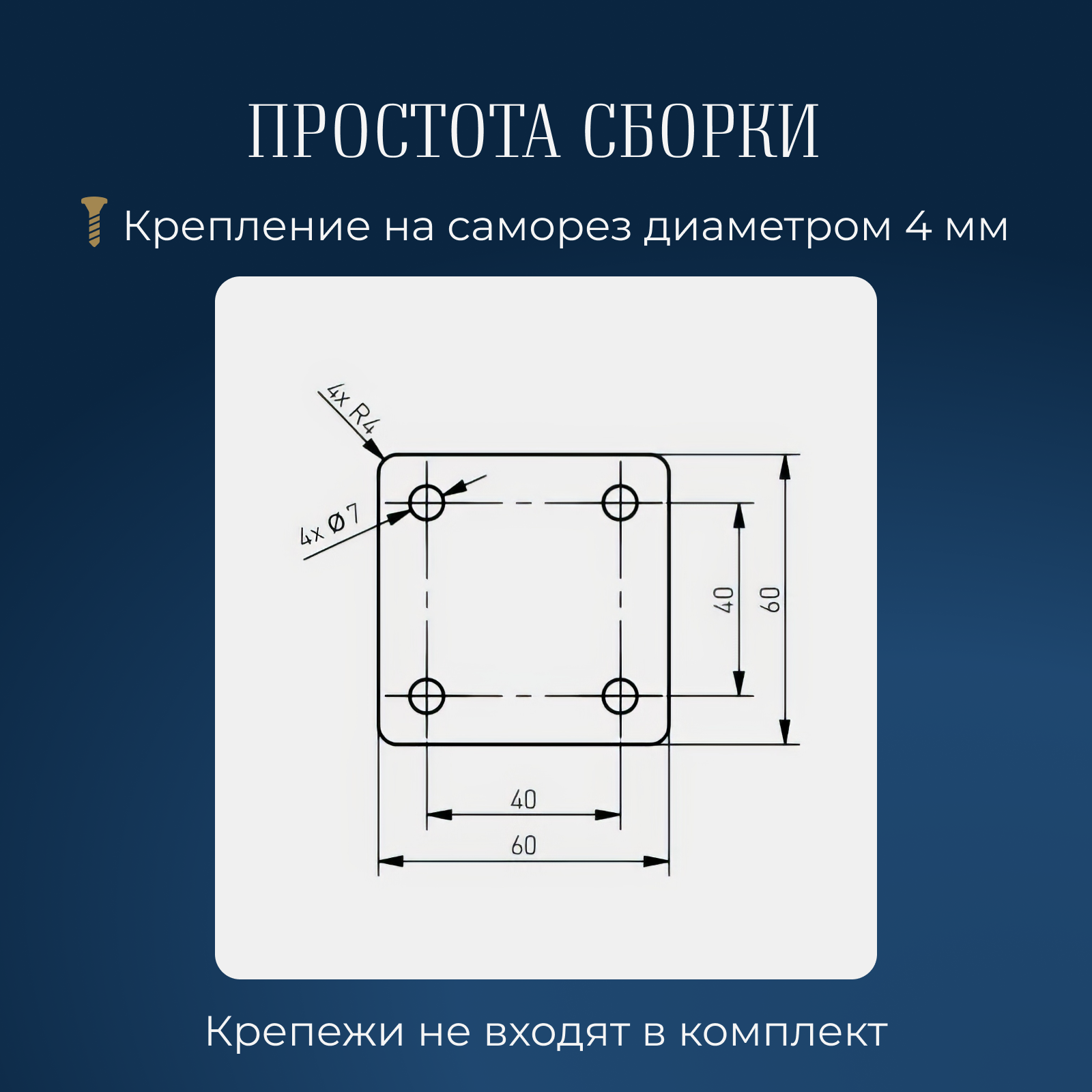 Размер монтажной пластины: 60 x 60 мм. Крепится при помощи саморезов.