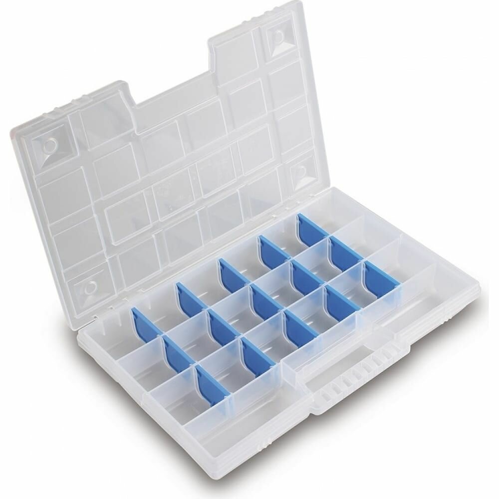 Корпус изготовлен из полипропилена. Для предупреждения выпадения содержимого предусмотрены пластиковые защелки. Конструкция включает в себя ручку, для удобного перемещения органайзера. Благодаря прозрачной крышке, вы всегда можете проверить наполнение органайзера, не открывая его.