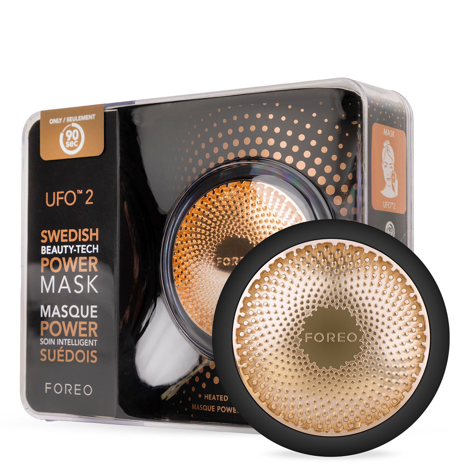 | Способ применения | 1. Загрузите приложение FOREO For You и подключите устройство UFO 2.2. Закрепите маску на UFO 2 с помощью фиксирующего кольца.3. Начните процедуру в приложении.4. Аккуратно перемещайте UFO 2 круговыми движениями, пока устройство не выключится. 5. Утилизируйте тканевую маску и промой UFO 2 под струей воды. |