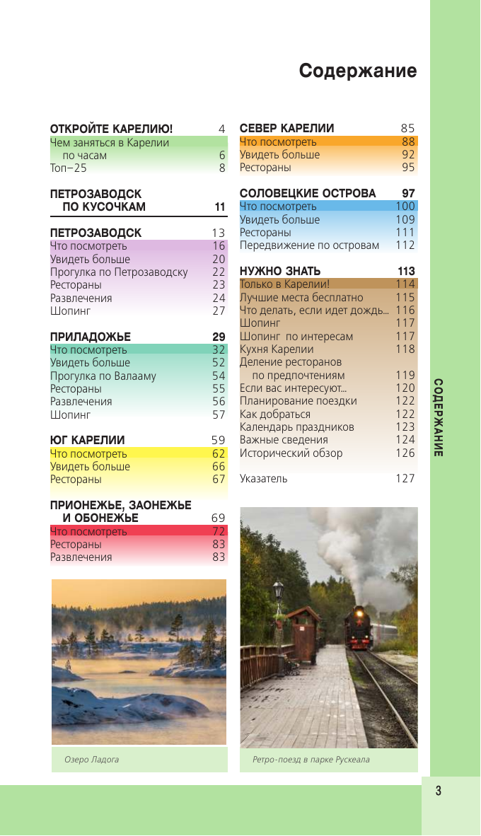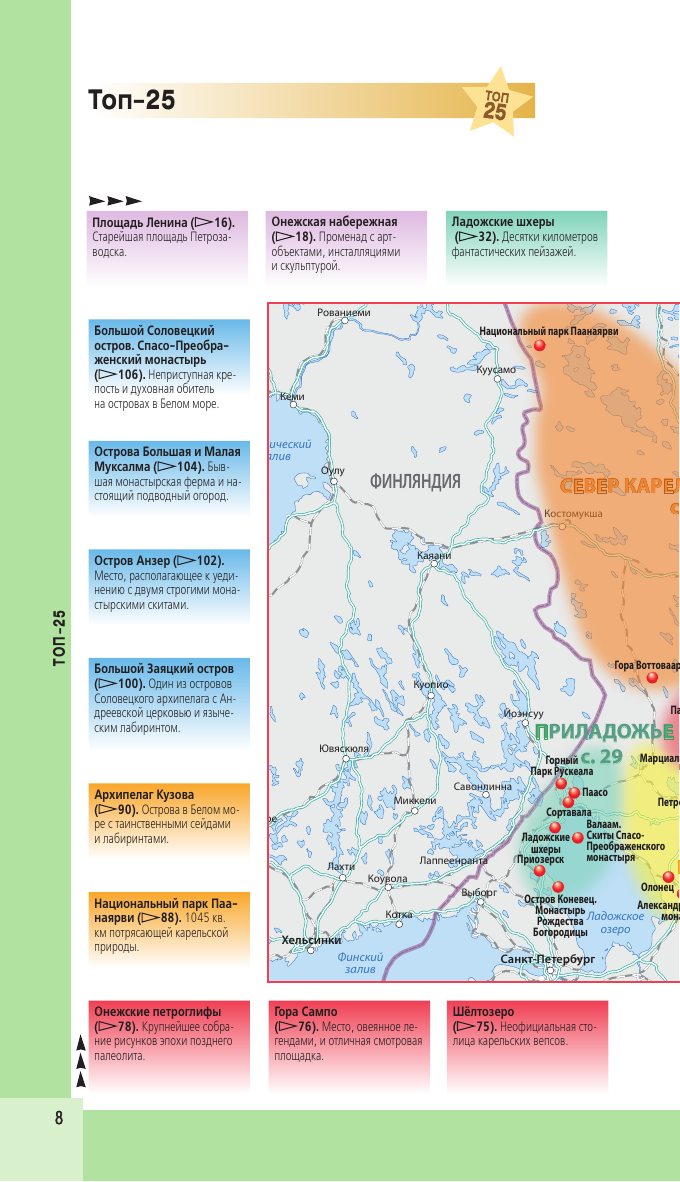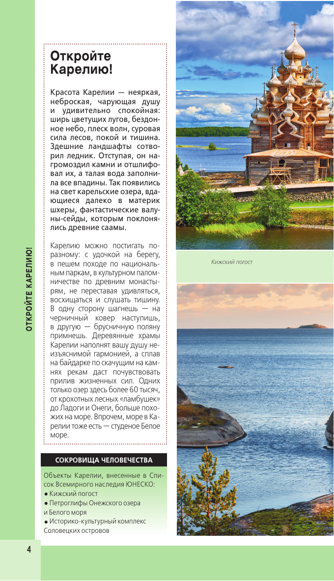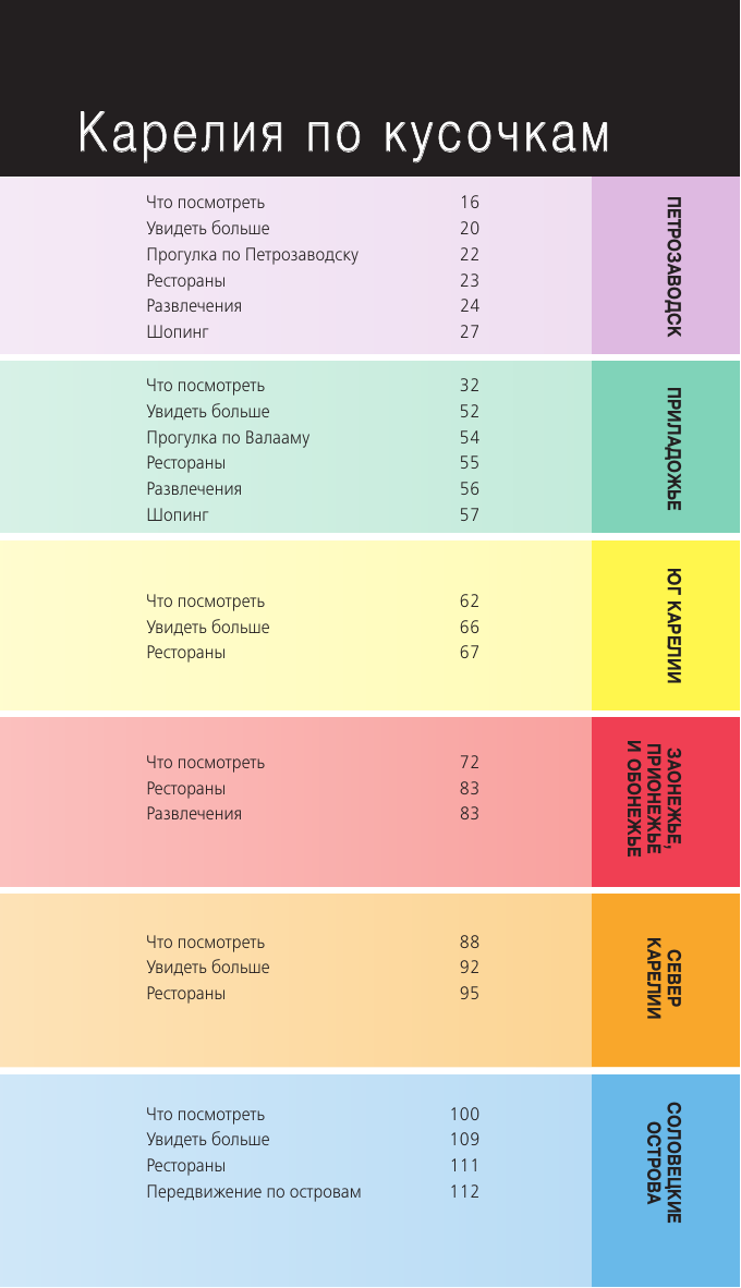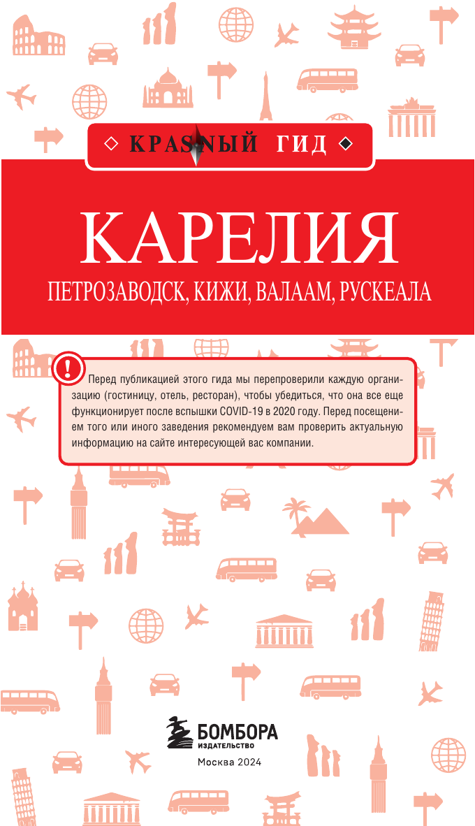 Перед вами путеводитель по Карелии одному из самых популярных направлений этого года. В нем содержится актуальная и полезная информация о республике, советы, как лучше провести первый и второй дни, куда сходить, а также топ-25 главных достопримечательностей. В путеводителе вы найдете описания самых интересных мест Карелии Петрозаводск, Кижи, Валаам, Рускеала, а сориентироваться на местности вам помогут удобные карты, расположенные на страницах гида. Вся необходимая информация о том, где остановиться и попробовать местную кухню, куда пойти и как провести время, всегда доступна с серией путеводителей «Красный гид»!