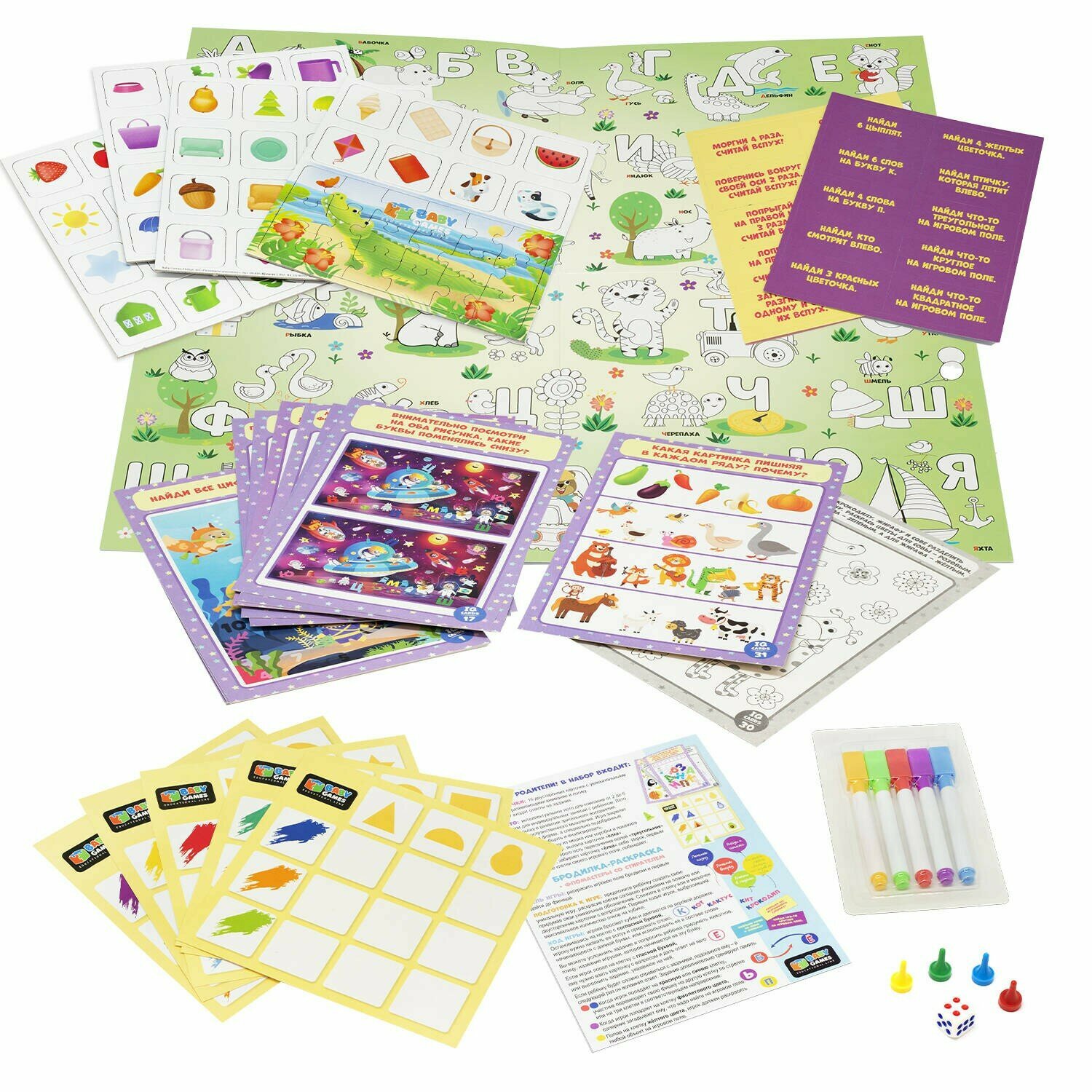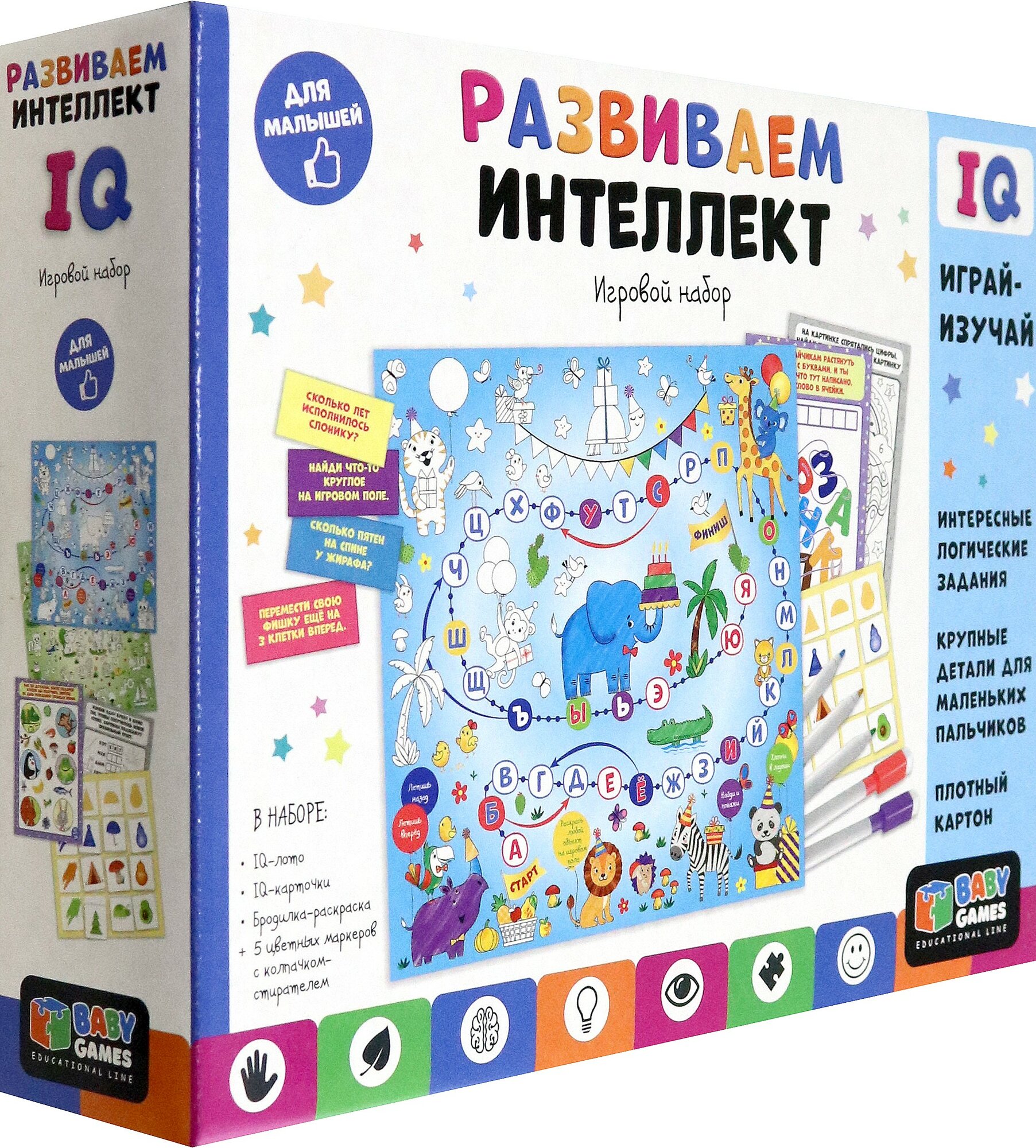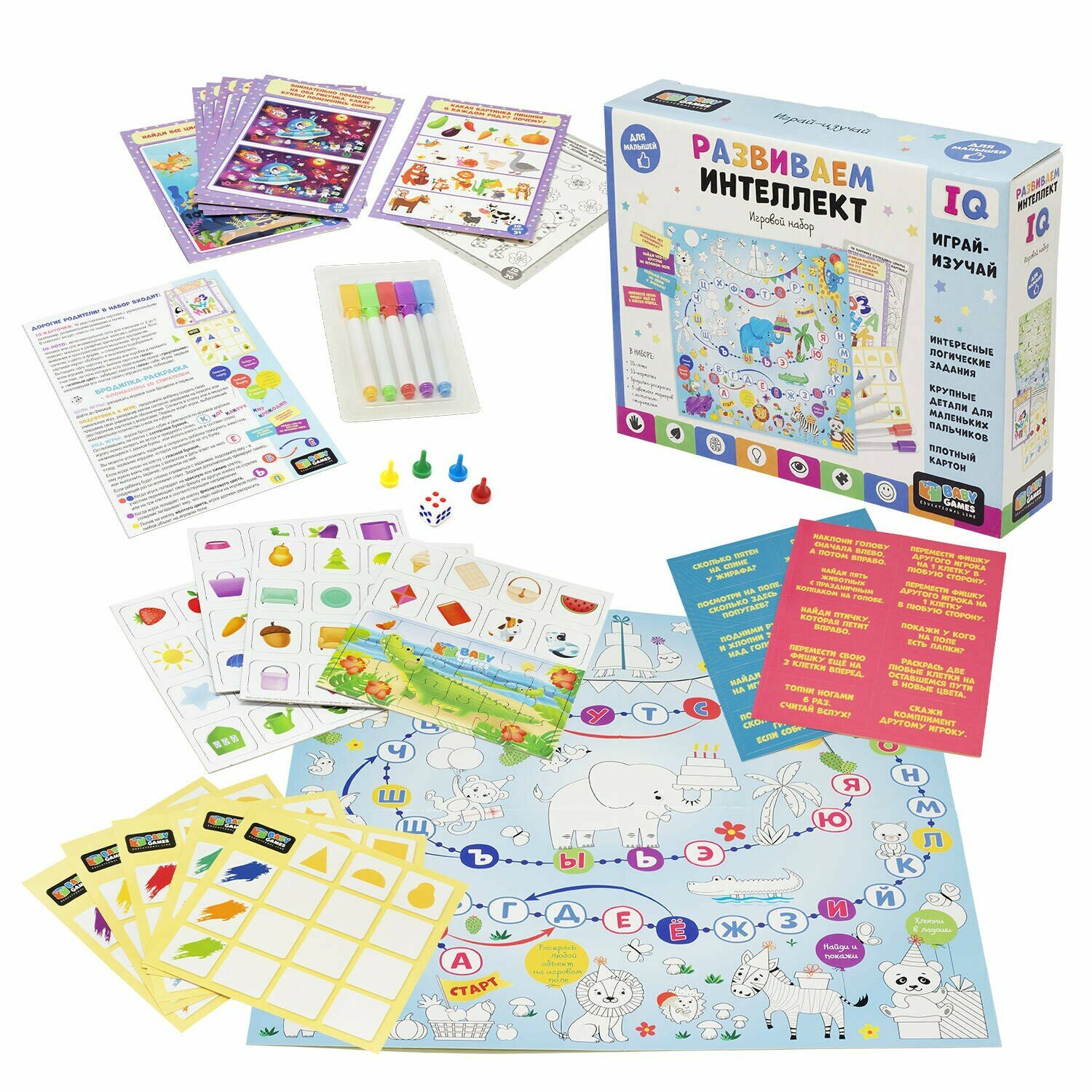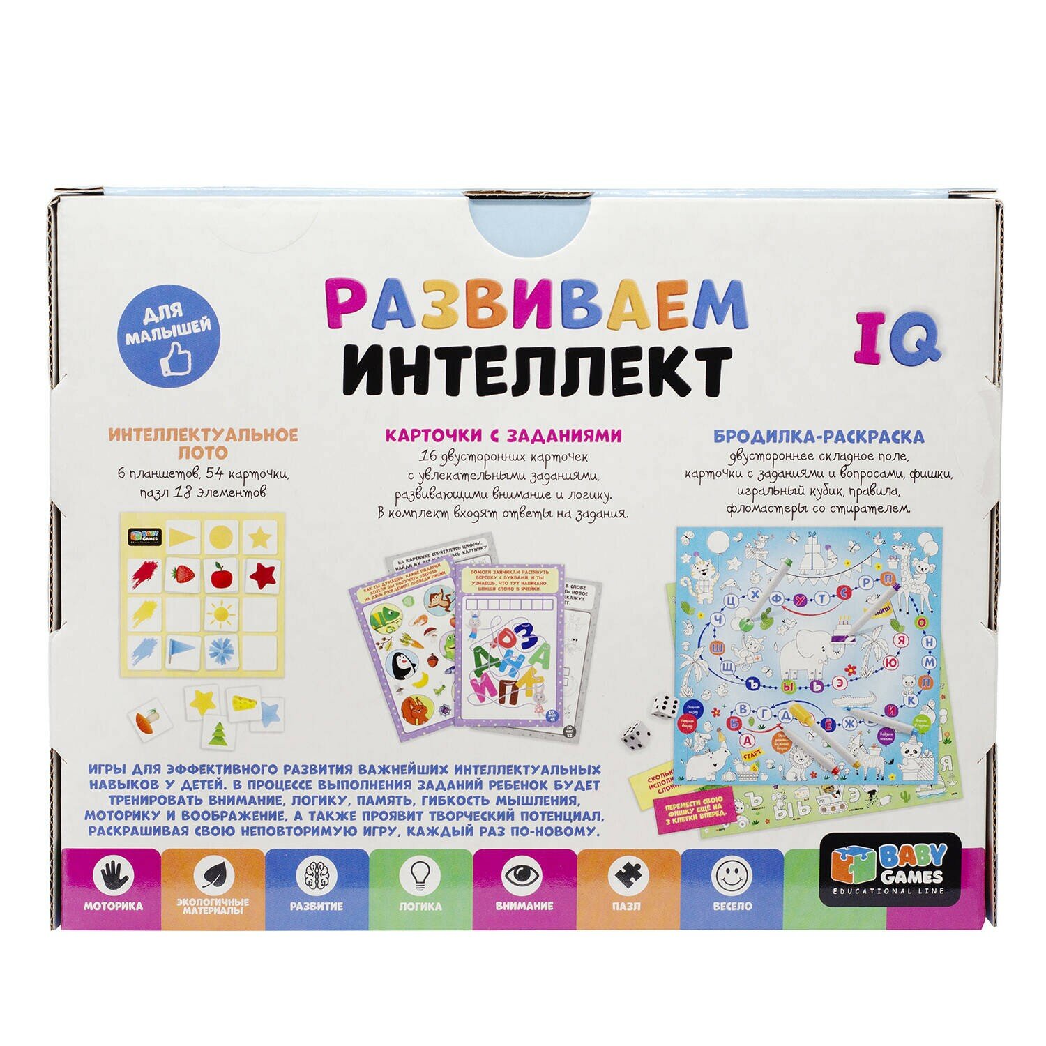 В наборе: бродилка-раскраска, 5 фломастеров, IQ-лото, IQ-карточки.