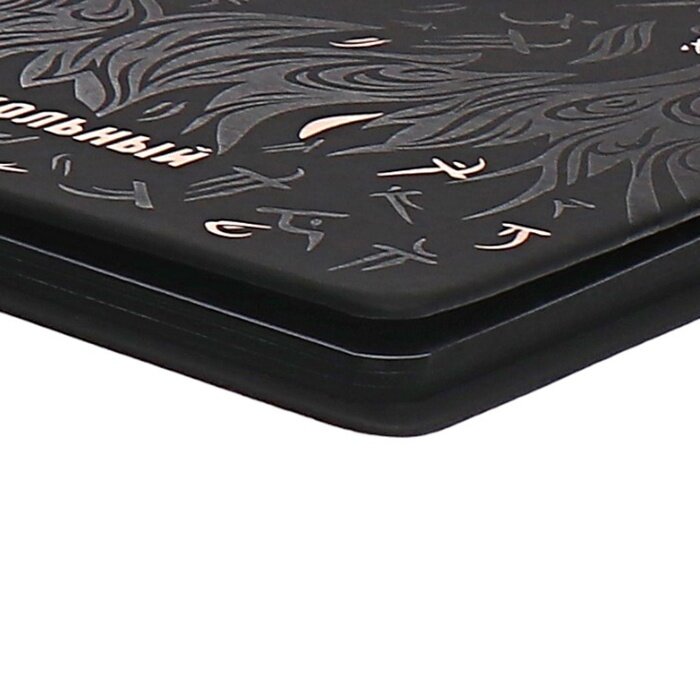 Обложка: искусственная кожа "Лейкер софт-тач", аппликация из пластика, блинтовое тиснение, тиснение фольгой, углы обложки закруглённые, углы блока закруглённые, отделка среза: окрашивание пантоном