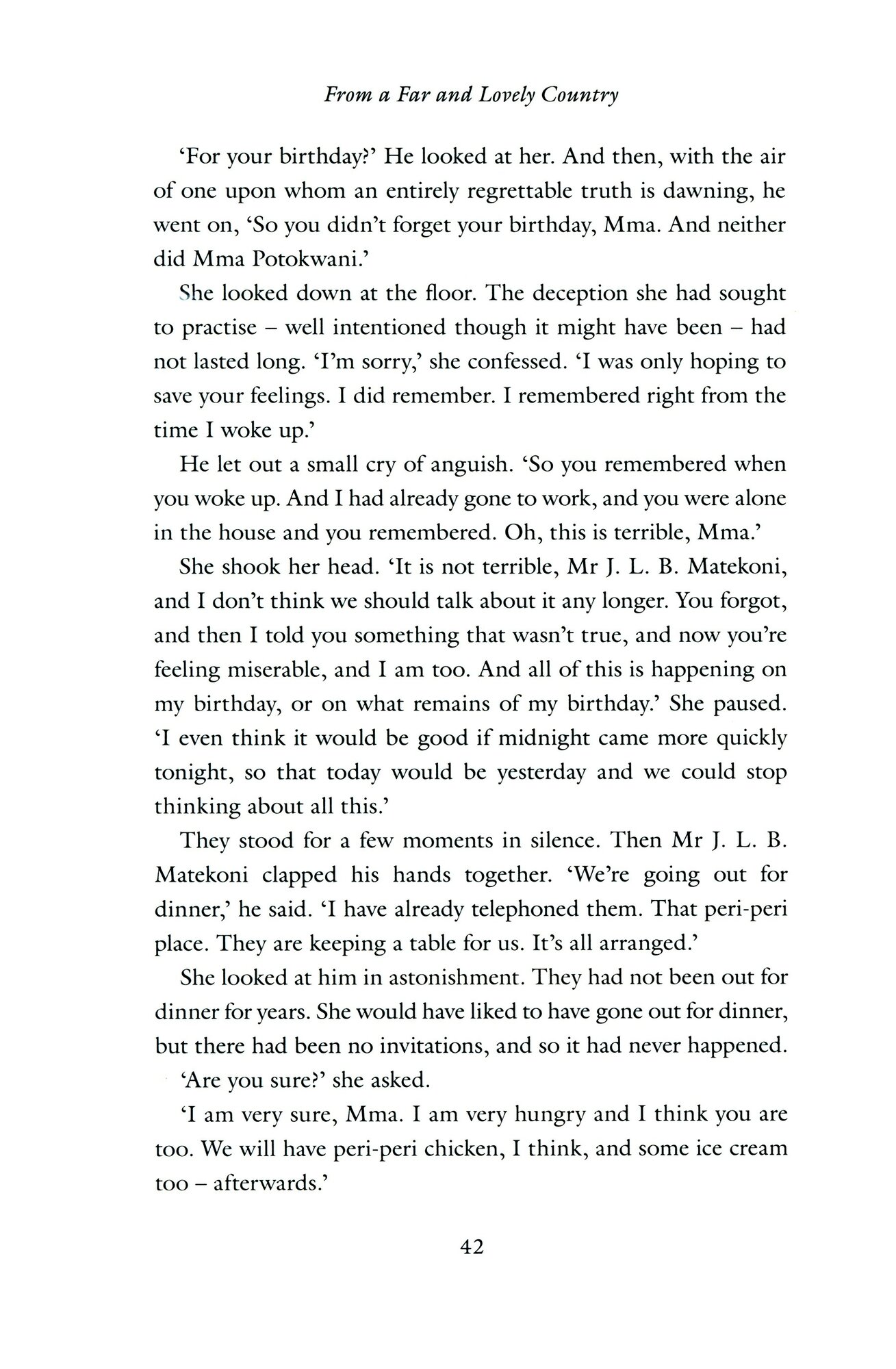 And all the time, she and her assistant, Grace Makutsi, are getting on with their normal lives – which, of course, include birthdays and the buying of birthday presents. A new dress makes a fine present, but not if, when being tried on, it splits in a way that is thought to be irreparable. Mma Potokwani has dealt with situations far worse that, and in dealing with this local emergency she shows her characteristic wisdom. At the end of the day, disaster is averted. Life in Botswana, that far and lovely country of the title, continues smoothly, which is what Mma Ramotswe and her friends want – and most certainly deserve.