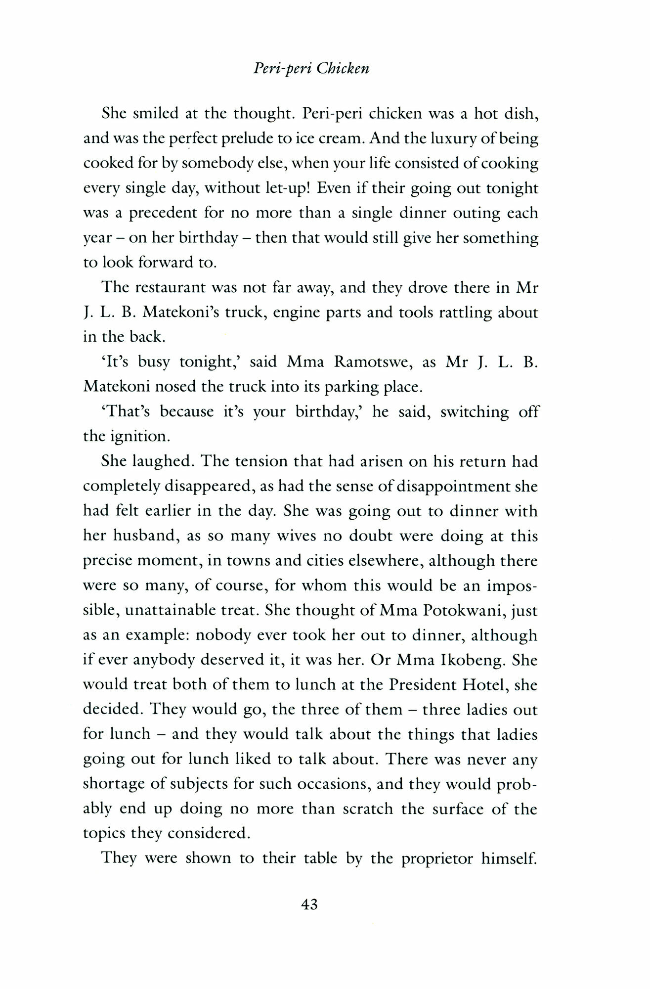 If you are the founder and Managing Director of the No. 1 Ladies’ Detective Agency you may expect complete strangers to approach you with their problems when they see you having dinner with your husband in a peri-peri restaurant. And if you are Precious Ramotswe, you are a kind and helpful person who will be willing to take on a quest to find the relatives of a man who, many years ago, left the country for the uncertainties and dangers of a distant conflict.