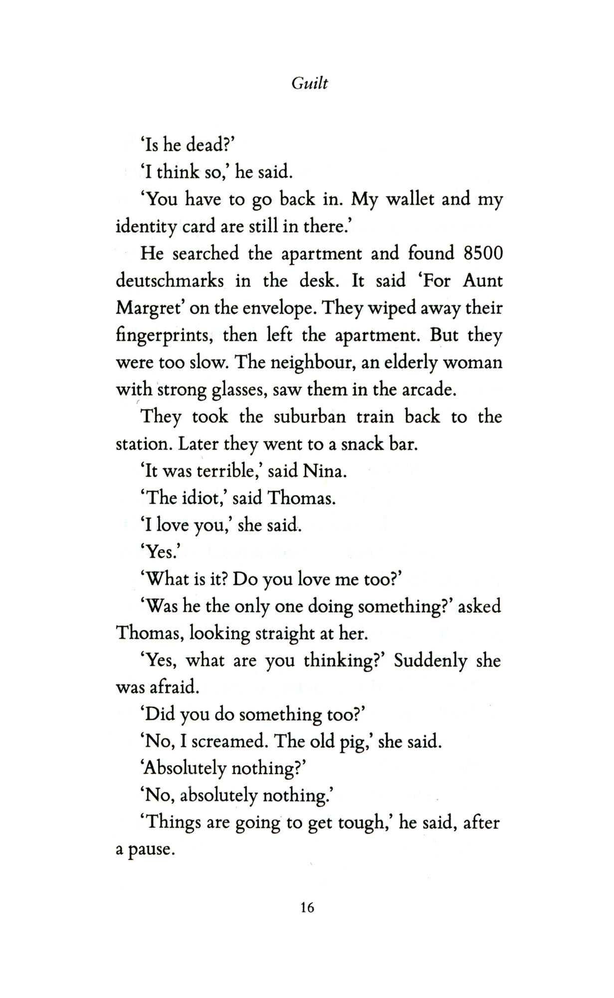 In Guilt, people commit violent, extraordinary acts; some are convicted in a court of law, others are not. But our narrator, a nameless lawyer, knows that this is never the whole story.