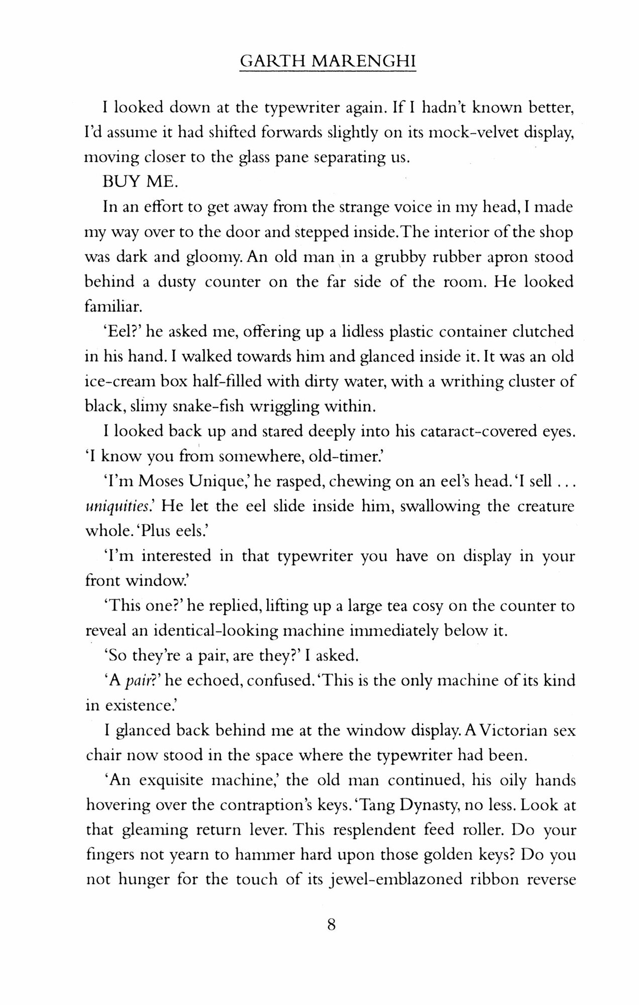 When horror writer Nick Steen gets sucked into a cursed typewriter by the terrifying Type-Face, Dark Lord of the Prolix, the hellish visions inside his head are unleashed for real. Forced to fight his escaping imagination - now leaking out of his own brain - Nick must defend the town of Stalkford from his own fictional horrors, including avascular-necrosis-obsessed serial killer Nelson Strain and Nick's dreaded throppleganger, the Dark Third.