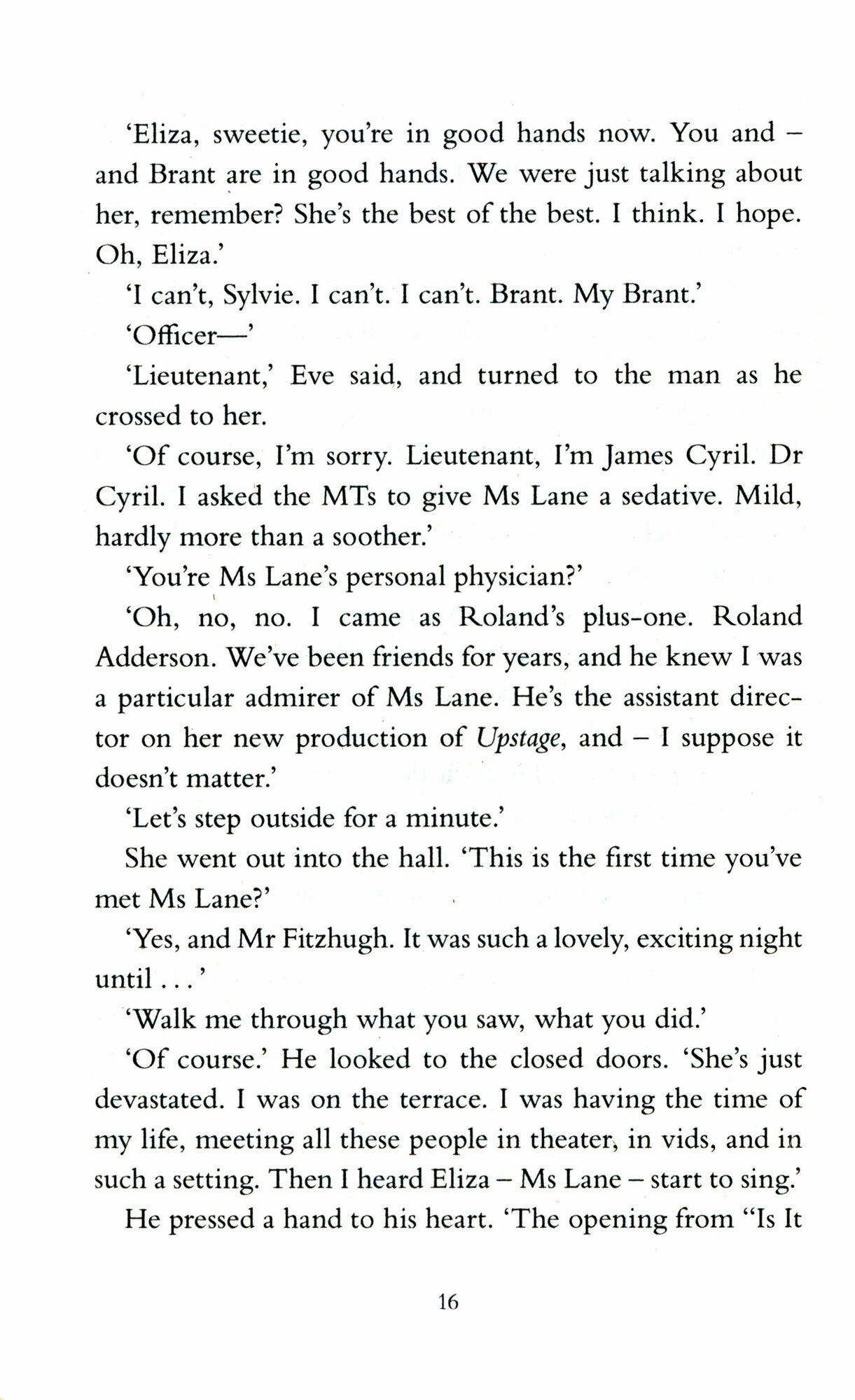 It was a glittering event full of A-listers, hosted by Eliza Lane and Brant Fitzhugh, the most glittering of all celebrity couples. Everyone had expected the party to be in the newspapers the next day but not because one of the hosts was murdered! As the crowd had gathered to watch Eliza sing, Fitzhugh had raised a final toast to his glamorous wife and fallen to the floor. Death by cyanide poisoning. It’s time for Lt. Eve Dallas to make her entrance.