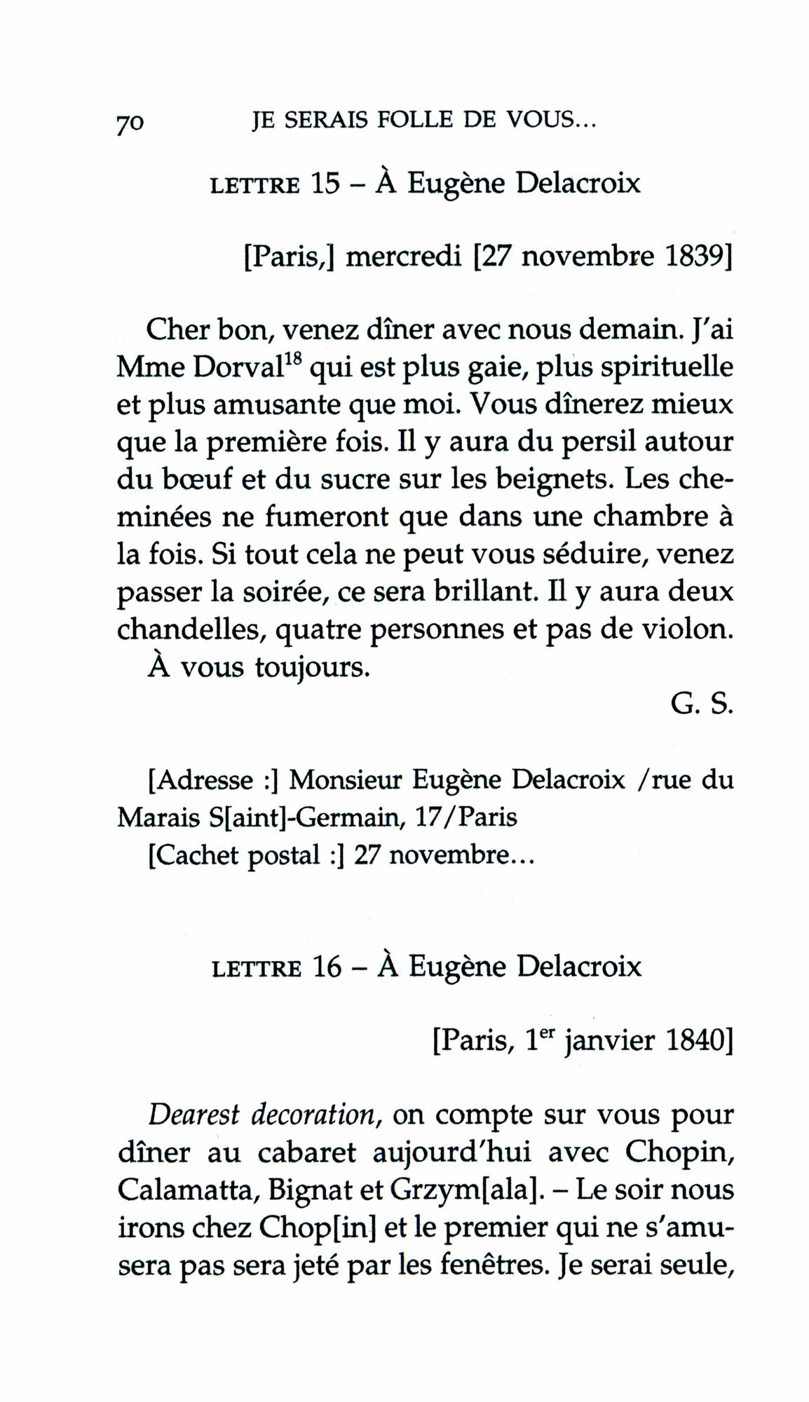 George Sand fut en relation avec ce que le XIXe siecle compta de celebre, et ce dans tous les domaines. Parmi ses correspondants les plus connus, on trouve bien sur des ecrivains, des editeurs, mais aussi des musiciens et des peintres, des hommes politiques… Certains d’entre eux ont droit a une place particuliere et nouent avec elle un echange epistolaire arborant les couleurs de l’amitie, dont le peintre Eugene Delacroix, qu’elle appelle « Lacroix », avec une desinvolture quasi impertinente.