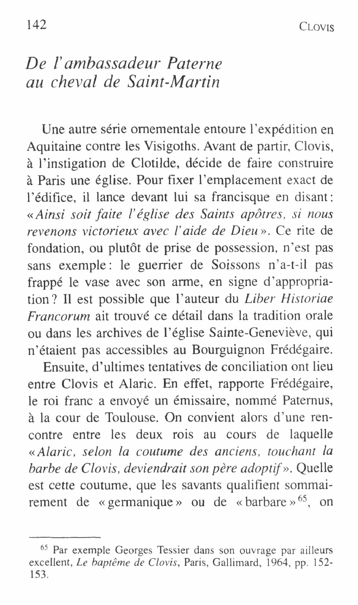 L’information que nous livre, presque seul, l’eveque Gregoire de Tours sur Clovis est pourtant bien incertaine. La date meme de son bapteme n’est pas assuree. C’est pourquoi, apres s’etre attache a reconstituer ce qui, dans le parcours meme du roi, est le plus vraisemblable, il fallait montrer comment s’est construite et a ete utilisee cette figure de legende.