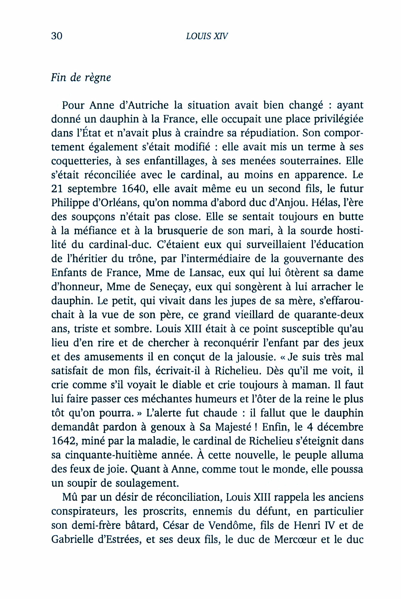 Ce livre est autre chose qu'une biographie classique. C'est tout le regne qu'il embrasse dans une vision generale de la societe du Grand Siecle, renouvelant le sujet, mettant a mal bien des cliches et des vieilles lunes grace a une documentation considerable, dont de nombreuses etudes etrangeres peu accessibles, grace tout autant a une analyse remarquable, originale, juste, du pouvoir, de ses serviteurs, de ses moyens d'action et de propagande, de sa grandeur, mais aussi de ses limites et de ses contradictions.