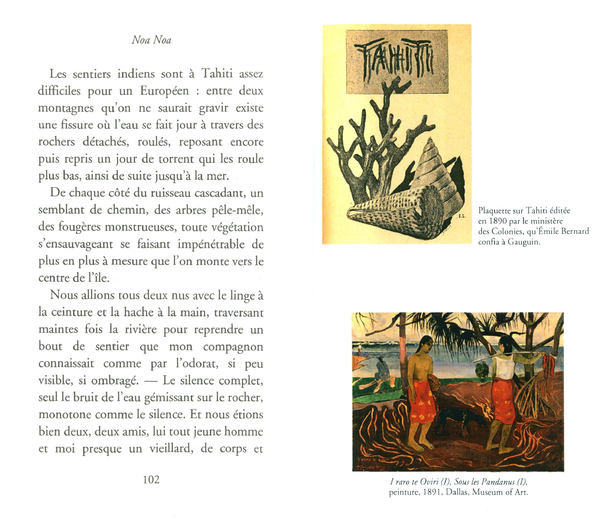 Cette edition du Noa Noa se lit comme une declaration d’amour a la nature triomphante. Inversion des valeurs : l’« homme civilise », se trouve nu devant le « sauvage ». La vahine sa compagne, pretresse instinctive de l’amour assiste a la metamorphose du peintre qui la celebre au plein soleil de la couleur.
