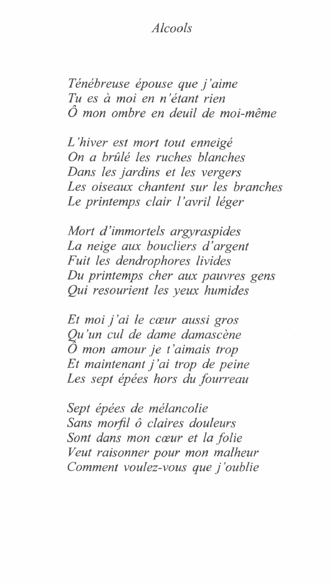 Pour Guillaume Apollinaire, la poesie se trouve en toute chose, dans les legendes comme dans les souvenirs mythologiques, dans les bruits de la rue et sur les murs de la ville, dans la vie sous toutes ses formes, dans le temps qui s’enfuit et la Seine qui coule sous le pont Mirabeau.