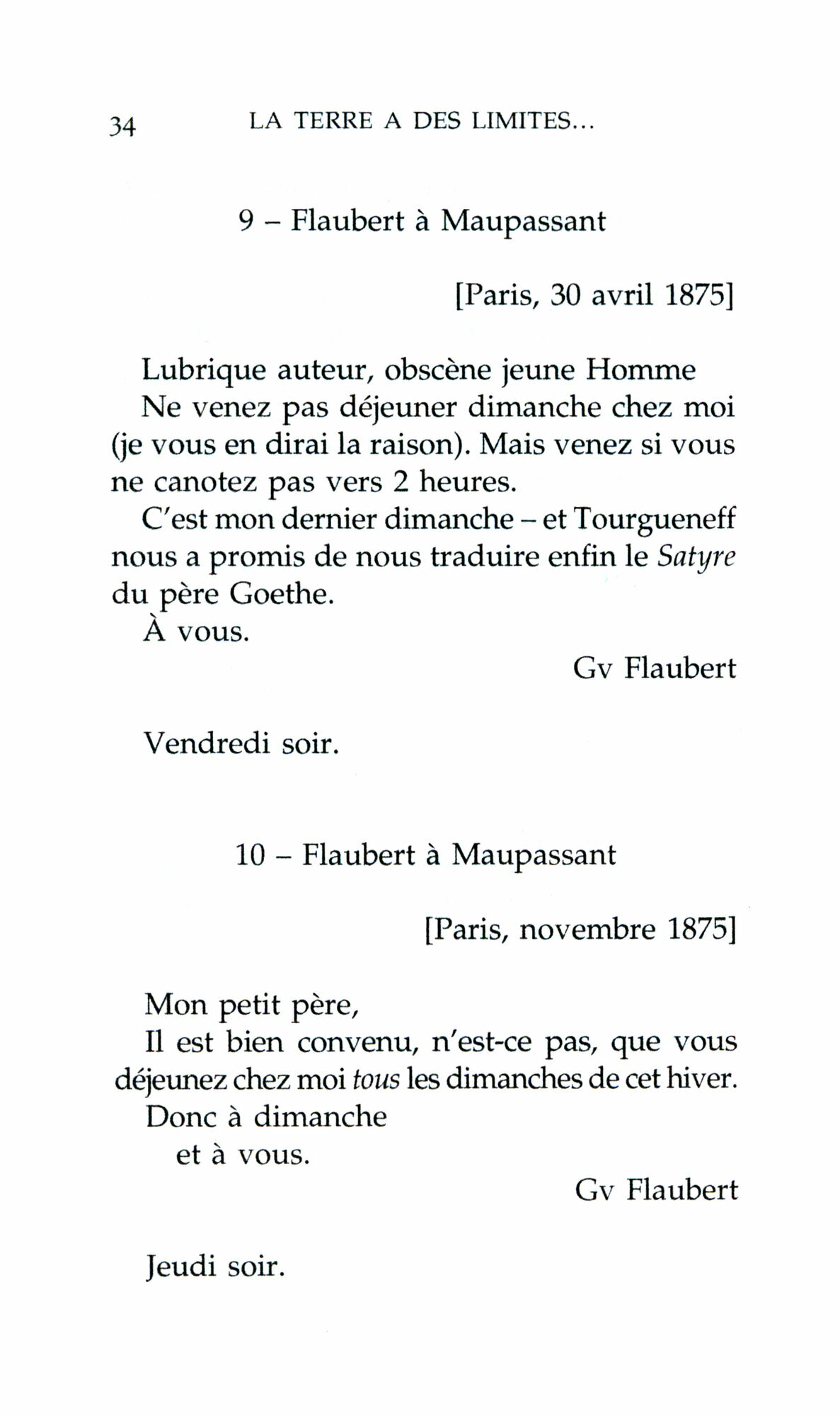 Il existe une relation quasi filiale entre Flaubert et Maupassant. Le premier a 52 ans quand debute cette correspondance, le second 23 ans. Ils ne se quitteront plus jusqu’a la mort de Flaubert, en 1880. Ainsi, cette correspondance permet de suivre Flaubert dans les sept dernieres annees de sa vie et Maupassant dans ses sept premieres annees en litterature.
