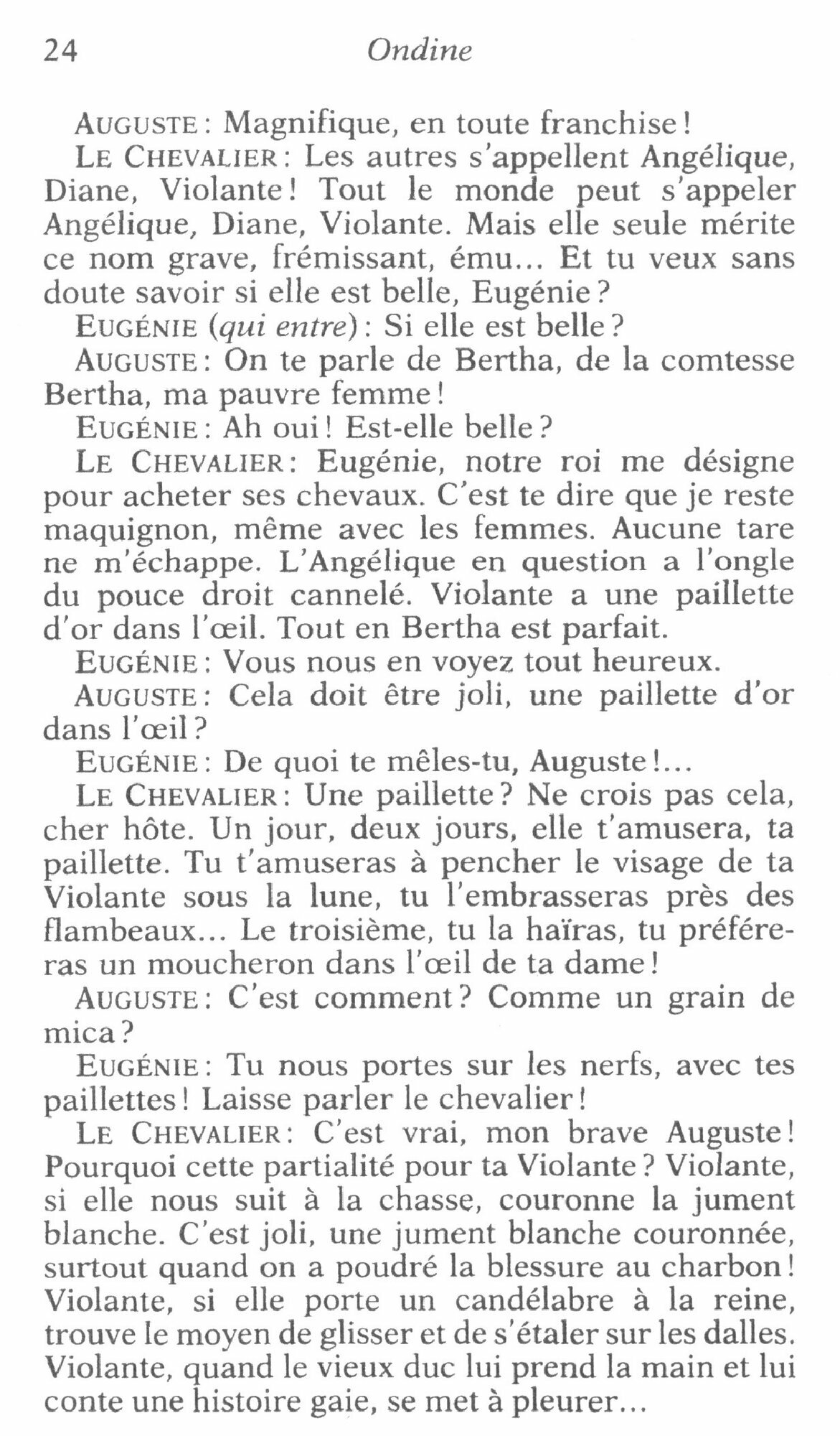 Poetique, etincelante, avec un dialogue d'une rare richesse, Ondine, piece en trois actes, qui met en scene la fragilite des amours humaines, a ete creee le 4 mai 1939 au theatre de l'Athenee sous la direction de Louis Jouvet qui jouait le role du chevalier.