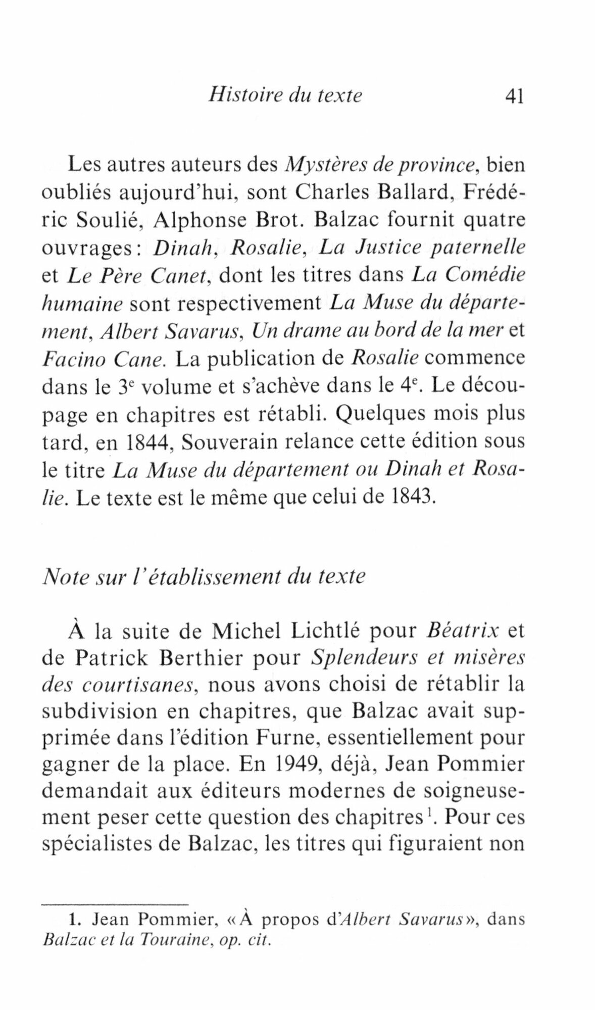 « Un lac est plein d’amour ! » s’ecrie Rosalie en ouvrant sa fenetre sur « la belle nappe d’eau » des Rouxey. « Ils se sont aimes devant des lacs ! » Ils, c’est le couple d’amants que forment Albert, jeune avocat parisien exile a Besancon, et Francesca, une belle duchesse italienne. Rosalie s’est jure de les desunir. Albert Savarus est une histoire d’amour et de fureur, mais comme toujours chez Balzac, la passion s’inscrit dans le reel : le mariage bute sur la difference de classe et de fortune, les belles promesses ne resistent pas a l’epreuve du temps, le romantisme se fracasse sur la politique. Cruelle desillusion pour qui voulait posseder l’absolu ! N’est-ce pas ce que Balzac pressent pour lui-meme en 1842, un des moments les plus amers de sa vie ? En creant l’emouvant personnage d’Albert, son double, mine par l’attente et l’usure du desir, il espere exorciser un destin redoute.