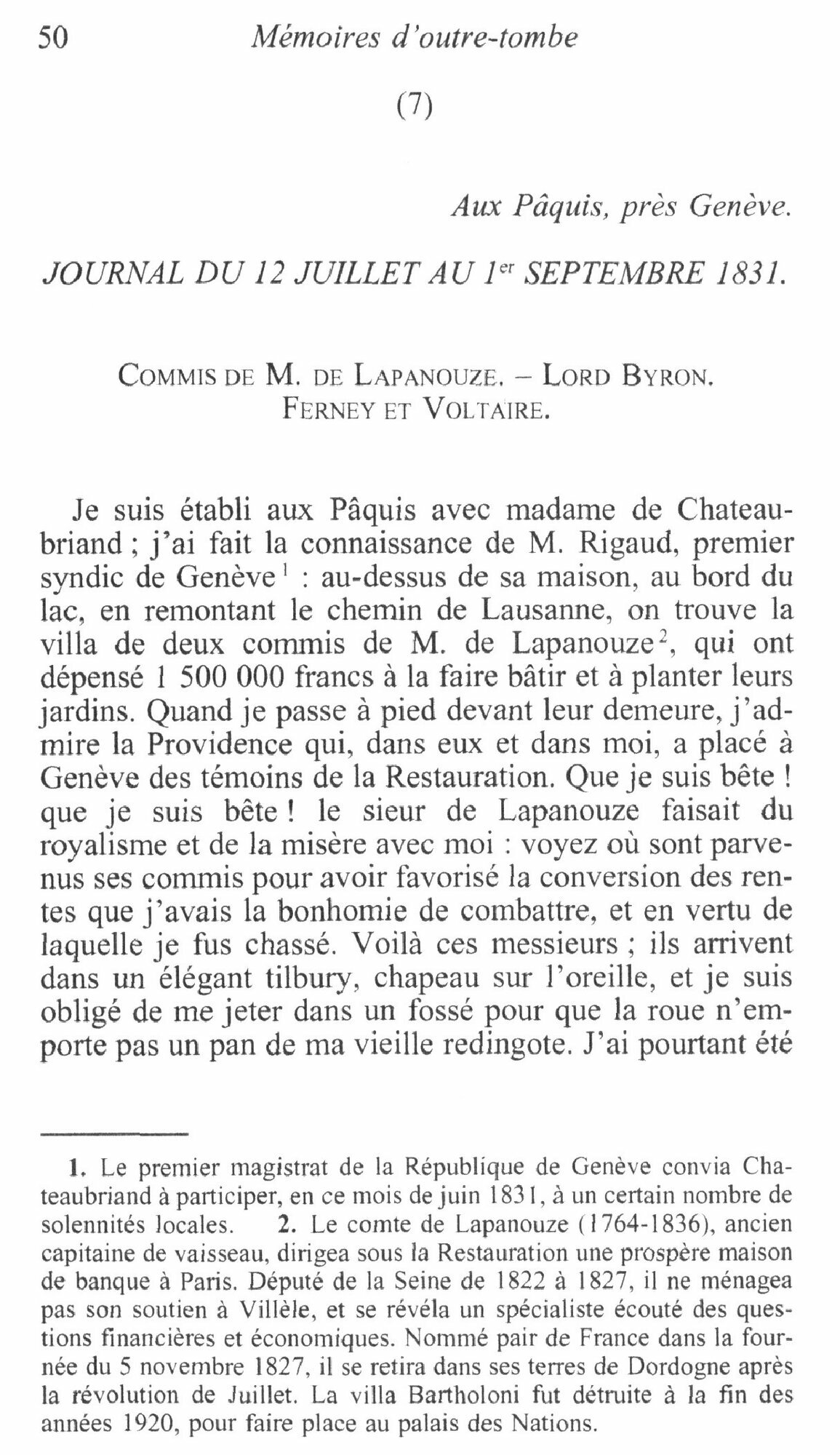 Cette quatrieme partie des Memoires nous conduit de 1830 a la date symbolique que portent les dernieres lignes : 1er novembre 1841, trente ans apres le debut de leur redaction a la Vallee-aux-Loups. Mais cet ultime volume ne fut pas ecrit apres les autres. Tout au contraire, il les accompagna et son ecriture, comme dans un miroir, les reflechit et a sa maniere les recommence puisqu'il est ici question, a nouveau, comme si les trois «carrieres» se redeployaient, de litterature, de politique et de voyages : en Suisse, a Venise, a Prague aupres du vieux roi Charles X. Et c'est une experience du retour : du present vers le passe, du passe vers le present. L'ecriture maintenant s'ouvre au discontinu qui est aussi le scintillement du poetique, comme si, a une histoire ou a une existence de plus en plus problematique, ne pouvait desormais correspondre qu'un emiettement des pages - travail du provisoire et du suspens dans la liberte d'un loisir en attente de la mort : «Les scenes de demain ne me regardent plus ; elles appellent d'autres peintres.»