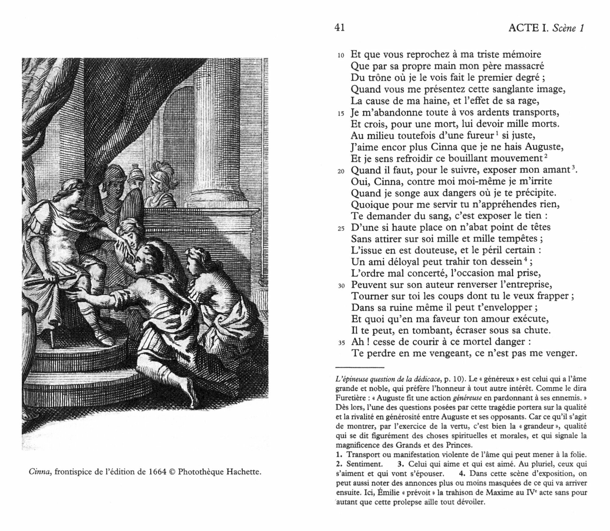Lorsque en 1642 il fait jouer Cinna au Theatre du Marais et fait de la magnanimite la clef de sa tragedie, Corneille offre au public une piece exemplaire ou le coup de theatre final est aussi un coup de maitre. La clemence d'Auguste force l'admiration mais elle est lentement conquise. Et devant cette tragedie politique, le spectateur n'oublie pas la virtuosite avec laquelle Corneille l'incite a reflechir aux passions qui conduisent au denouement et a l'exercice d'un pouvoir qui a finalement surmonte sa fragilite.
