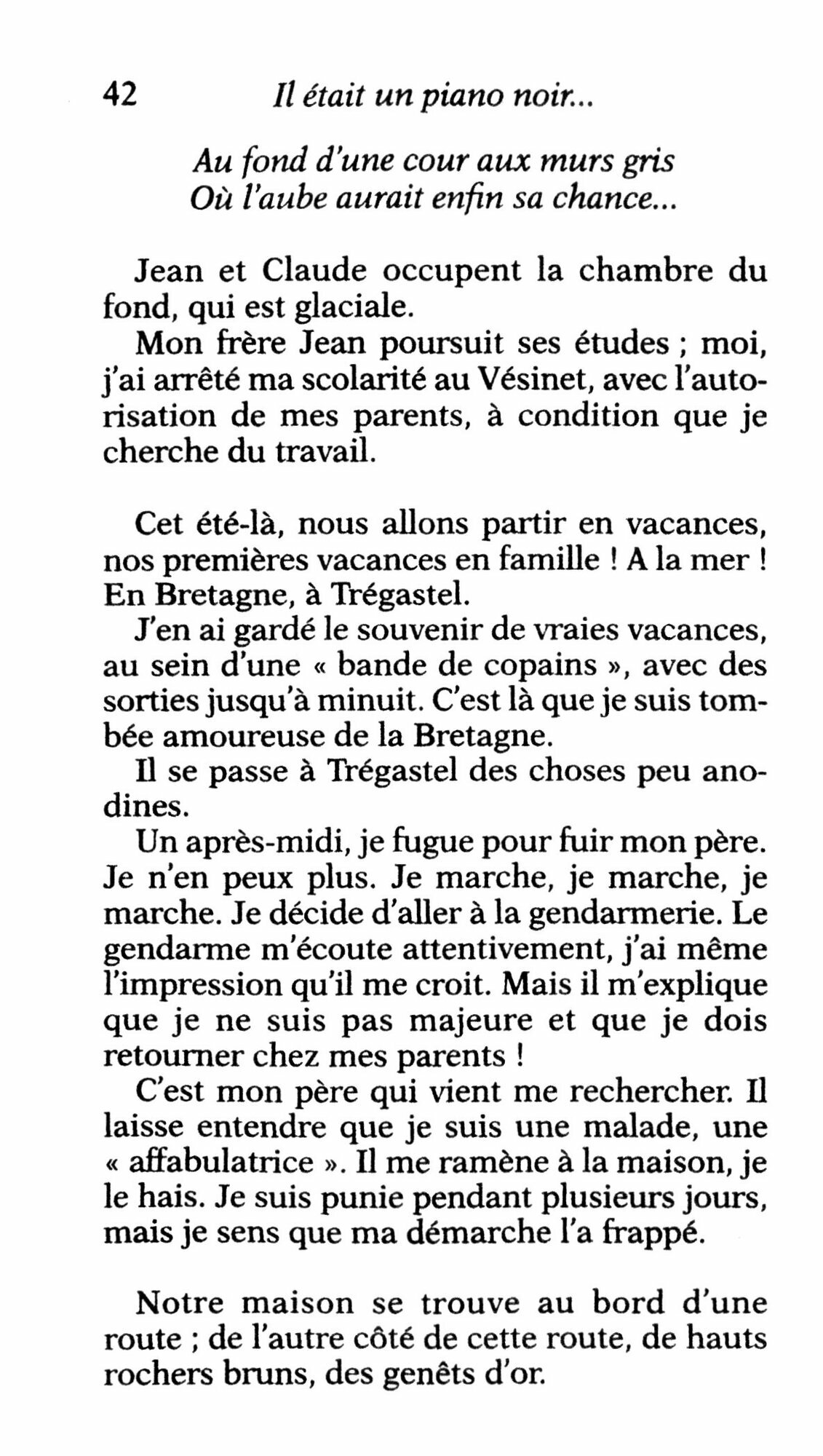 Nous y rencontrons la petite fille des Batignolles, qu'une enfance vagabonde, sur fond d'Occupation, amenera notamment a Marseille, a Tarbes, a Saint-Marcellin, avant le retour a Paris. Puis la jeune fille qui, bravant la misere et les deceptions, poursuivra obstinement son reve : chanter, devant un piano noir, jusqu'aux debuts a L'ecluse, aux premiers succes, aux tournees...