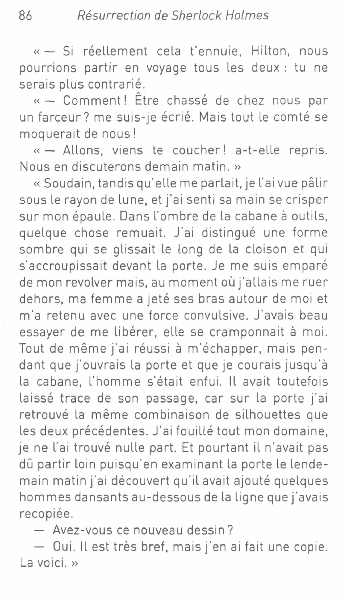 En 1891, a l’issue d’un combat mortel avec son ennemi de toujours, le professeur Moriarty, Sherlock Holmes disparait et tout le monde le croit mort. Mais, trois ans plus tard, sous la pression conjointe de ses lecteurs et de son editeur, Conan Doyle se voit contraint de le « ressusciter » ! C’est dans La maison vide, la premiere des treize nouvelles de ce recueil – dans laquelle Holmes decouvrira qui a assassine l’honorable Ronald Adair – , qu’on apprend de la bouche meme du fameux detective comment il a pu rechapper d’une mort certaine… Et, comme il se doit, nous devons a l’excellent Watson le recit de ces affaires palpitantes : La maison vide, L’entrepreneur de Norwood, Les hommes dansants, La cycliste solitaire, L’ecole du prieure, Peter le noir, Charles-Auguste Milverton, Les six Napoleons, Les trois etudiants, Le pince-nez en or, Un trois-quarts a ete perdu !, Le manoir de l’abbaye, La deuxieme tache.