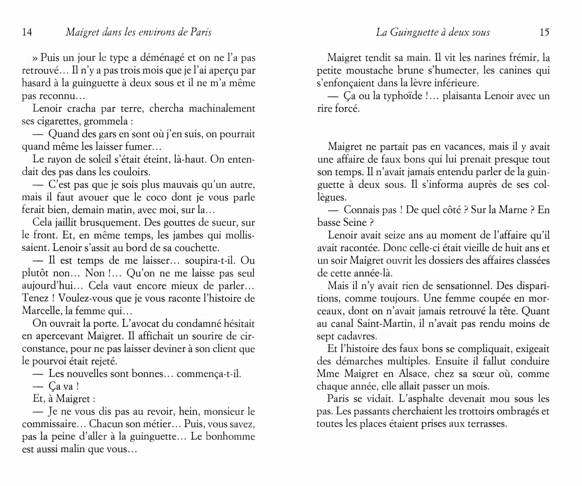 La Guingue deux sous (1931) : Comme chaque t, Mme Maigret est en vacances en Alsace. Au lieu de la rejoindre pour le week-end, le commissaire se lance dans une filature improvise qui le conduit une villgiature des bords de Seine. Cette atmosphre bucolique dissimule un crime sordide...
