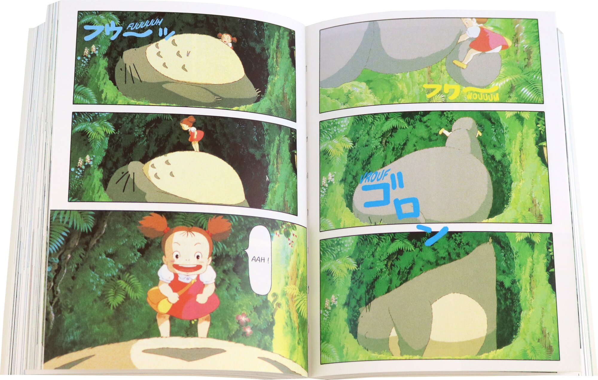 Voici le recit complet du film Totoro, montage en BD des images du film eponyme a la maniere du roman-photo. On y retrouve la famille Kusakabe, arrivant a la campagne et s’installant dans une maison bucolique pres de laquelle s’eleve un arbre immense. Mais dans ce dernier, reside Totoro, esprit de la nature bienveillant et protecteur qui va prendre les deux petites filles de la famille sous son aile.