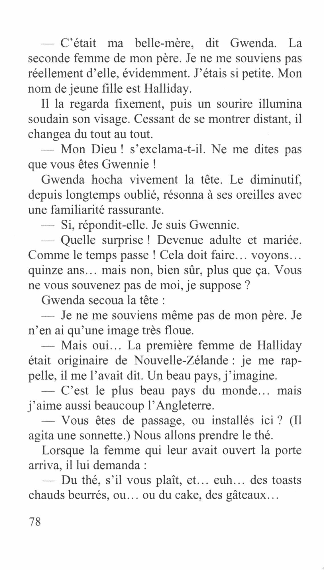 Lorsque Gwenda avait vu la villa, elle n'avait pas hesite une seconde. C'etait exactement ce qu'elle cherchait. Demodee peut-etre, mais charmante... Gwenda s'y etait sentie chez elle des le premier instant. Pour un peu, cette maison aurait pu etre celle de son enfance : chaque piece lui evoquait des souvenirs confus... Son imagination lui jouait des tours, bien sur. Comment pouvait-elle reconnaitre cet endroit puisqu'elle n'avait jamais mis les pieds en Angleterre auparavant ? Pourtant, tout lui etait familier... Pourquoi s'etait-elle sentie glacee de terreur en regardant dans le hall, du haut de l'escalier ? Pourquoi ? La villa etait-elle hantee ? Ou bien Gwenda devenait-elle folle ?
