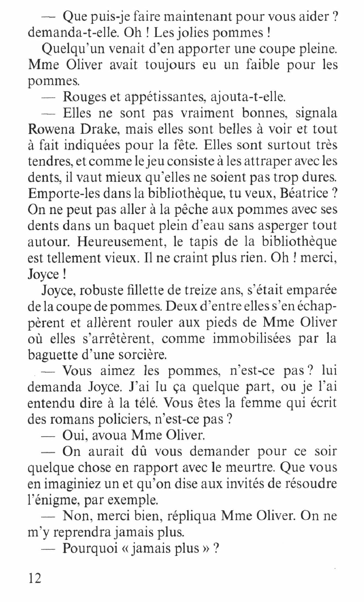 Le 31 octobre, les sorcieres s'envolent sur leur manche a balai : c'est Halloween, la fete du potiron. "Savez-vous que j'ai eu l'occasion d'assister a un vrai meurtre ? " se vante Joyce, une fillette a la langue bien pendue, lors d'une soiree enfantine chez Mrs Drake... Elle en mourra.