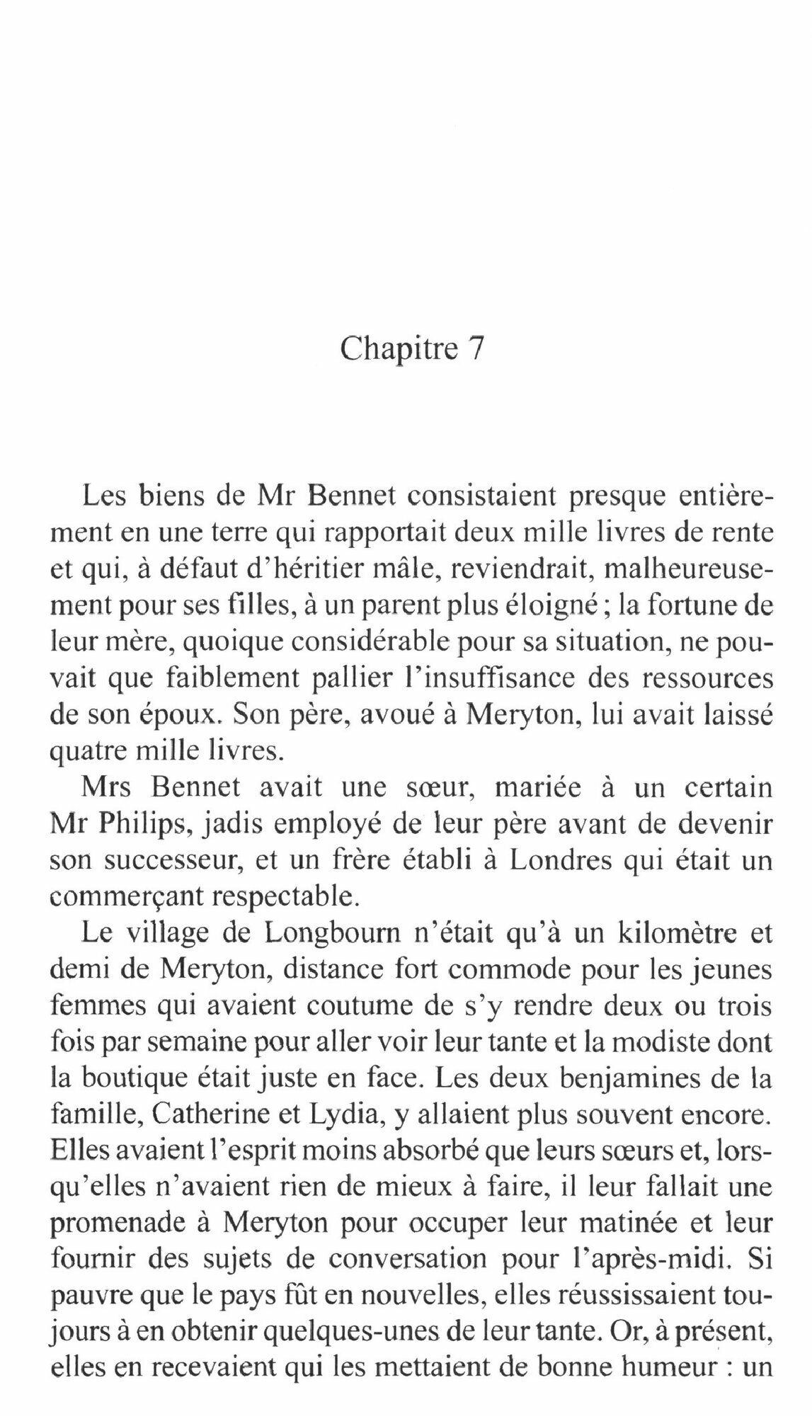 Elisabeth Bennet a quatre soeurs et une mere qui ne songe qu’a les marier. Quand parvient la nouvelle de l’installation a Netherfield, le domaine voisin, de Mr Bingley, celibataire et beau parti, toutes les dames des alentours sont en emoi, d’autant plus qu’il est accompagne de son ami Mr Darcy, un jeune et riche aristocrate. Les preparatifs du prochain bal occupent tous les esprits… Jane Austen peint avec ce qu’il faut d’ironie les turbulences du coeur des jeunes filles et, aujourd’hui comme hier, on s’indigne avec l’orgueilleuse Elisabeth, puis on ouvre les yeux sur les voies detournees qu’emprunte l’amour…