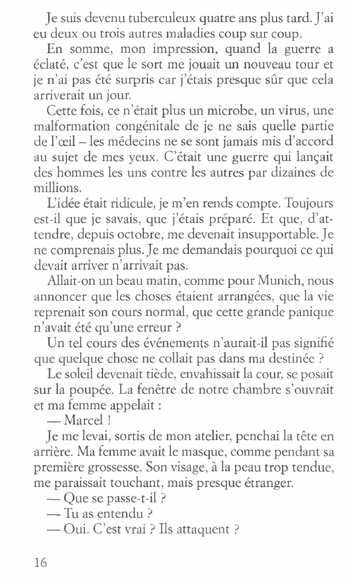 Quand je me suis eveille, les rideaux de toile ecrue laissaient filtrer dans la chambre une lumiere jaunatre que je connaissais bien. Nos fenetres, au premier etage, n’ont pas de volets. Il n’y en a a aucune maison de la rue. J’entendais, sur la table de nuit, le tic-tac du reveille-matin et, a cote de moi, la respiration scandee de ma femme, presque aussi sonore que celle des patients, au cinema, pendant une operation. Elle etait alors enceinte de sept mois et demi.
