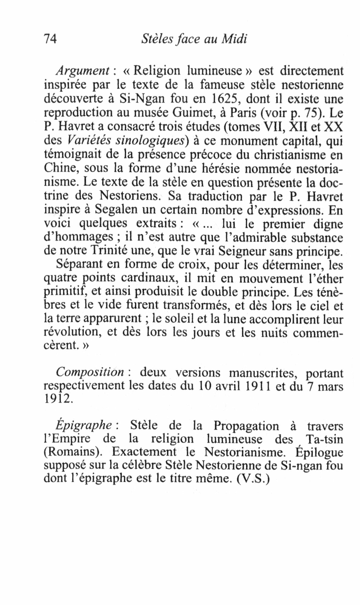 Dans chaque civilisation, les pierres parlent une langue singuliere. Enfant d'un pays de menhirs, Segalen decouvre au fil de ses sejours chinois, entre 1909 et 1914, les pierres ecrites. Il en concoit le projet de Steles : non pas un recueil de traductions, mais plutot une transposition, un detournement de la vertu pierreuse (petrifiee, petrifiante...) des mots au profit d'un monde de sensations et de visions qui lui est propre.