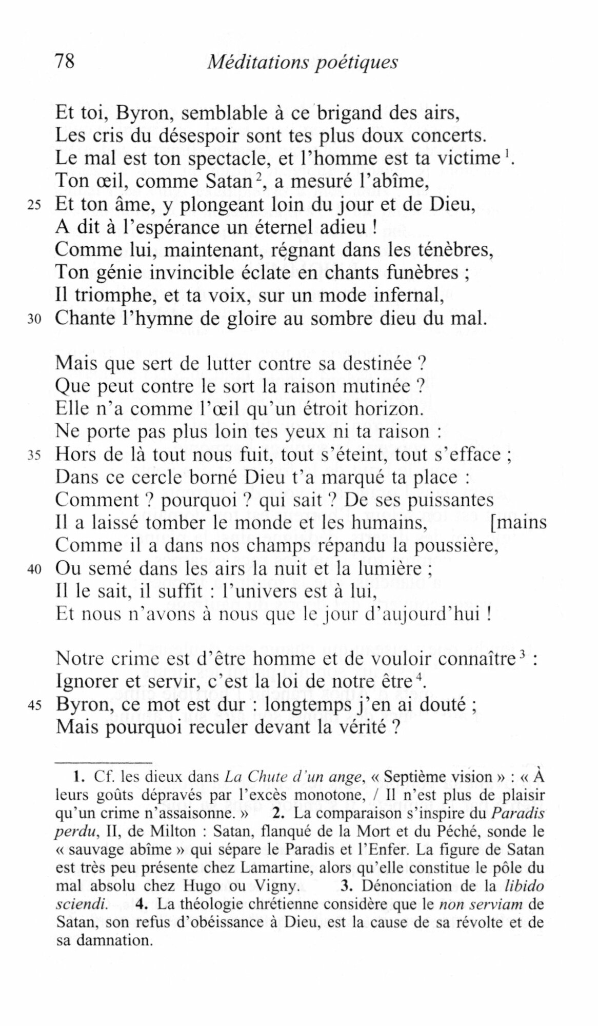 Et il est vrai que lorsque cette mince plaquette de vingt-quatre pieces parait en 1820, une revolution s’accomplit avec elle. Loin de l’ancienne fabrique, dans cette forme neuve qu’est la meditation, la poesie tout a coup devient emotion. En elle s’expriment des sentiments et des passions qui font rever, des verites qui agrandissent l’ame, et dans la simplicite d’un monde epure mer et mon-tagne, lac et vallon — une experience personnelle s’affirme, ou peut se retrou-ver la communaute des lecteurs : « D’un jour a l’autre, ecrit Sainte-Beuve, on avait change de climat et de lumiere, on avait change d’Olympe : c’etait une revelation. »