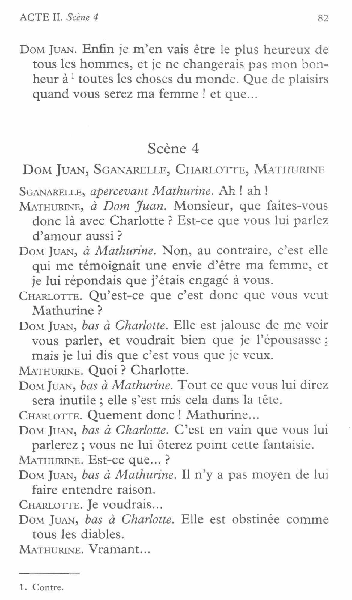 Dom Juan vient de quitter sa femme pour tenter d'enlever a son futur epoux une jeune fiancee trop eprise de son pretendant pour que l'idee ne lui vienne pas de troubler leur bonheur. Puis il jette son devolu sur de jeunes paysannes qu'il promet d'epouser. Sganarelle a beau timidement tenter de ramener son maitre libertin dans le chemin de la vertu et de la religion, Dom Juan prefere les plaisirs transitoires de ce monde, si dangereux pour son salut, a l'esperance d'une beatitude infinie. D'autres pourtant l'avertiront « qu'une mechante vie amene une mechante mort »...