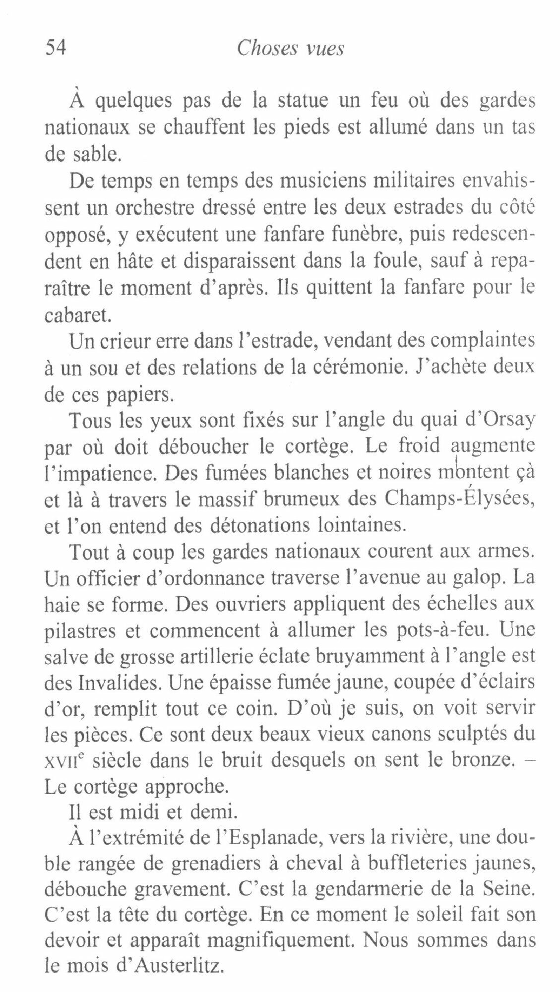 Le 15 decembre 1840, lors du transfert des cendres de Napoleon aux Invalides, Hugo se trouve parmi la foule ; le 22 fevrier 1848, quand commence ce qui sera une revolution, il quitte la Chambre des pairs pour assister aux affrontements de la place de la Concorde. Mais ce dont Hugo est temoin, c'est aussi l'agonie de Balzac dont il serre une derniere fois la main inerte, et de nombreux evenements de toute nature, dont, helas, les plus tragiques : la folie de sa fille Adele et la disparition de ses deux fils, Charles et Francois-Victor. C'est en 1887, deux ans apres sa mort, que son ami Paul Meurice puise dans ses papiers et carnets la matiere d'un premier volume de Choses vues qui plus tard s'accroitra. Des Memoires ? sans doute non. Une sorte de Journal, plutot, mais qui accueille a la fois des pages ecrites a posteriori et de simples notes tres diverses : un ensemble de fragments a la fois historiques et intimes, ou l'ecrivain, souvent place comme en retrait, nous propose, si l'on veut, sa chronique d'un demi-siecle.