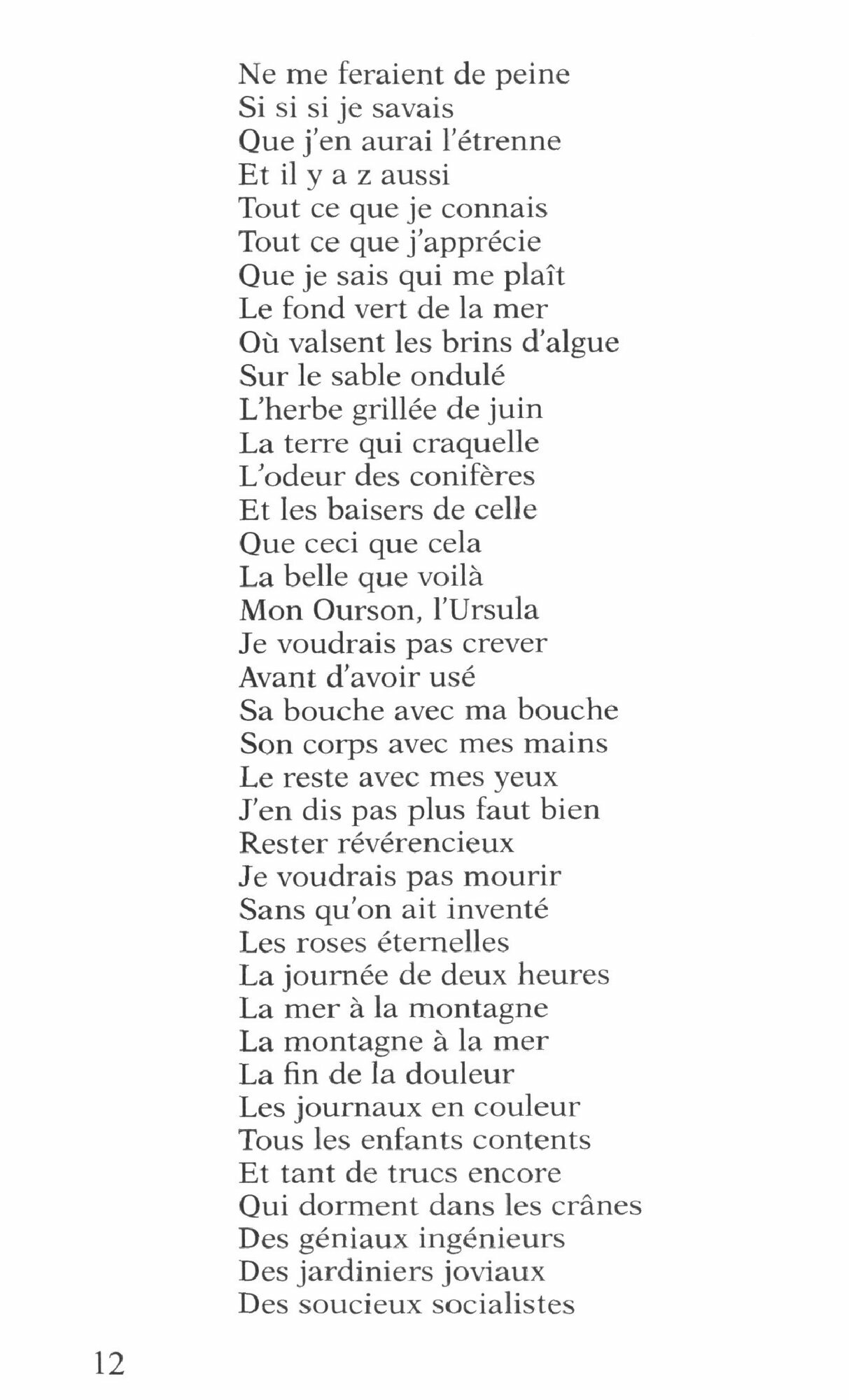 Je voudrais pas crever, poeme d’un homme jeune qui se sait bientot condamne, donne son titre a un recueil de vingt-trois poemes publies apres la mort de Boris Vian (1920-1959), et dont l’edition de 1962 a marque, avec quelques romans et nouvelles, le debut de sa gloire posthume. N’etait-ce point d’ailleurs une sorte de «chanson du neant»?