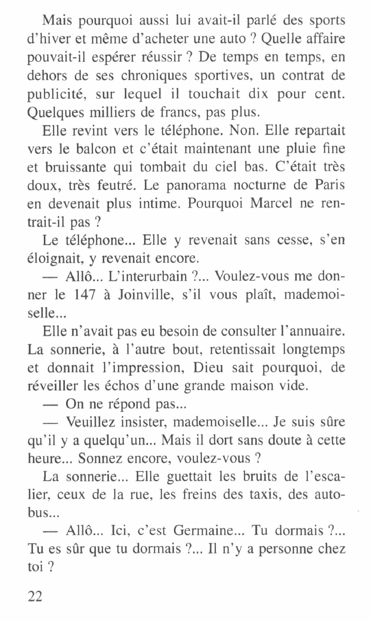 Pour le coup de telephone de sept heures, il n’y avait pas de doute : Marcel l’avait bien donne de son journal. Germaine venait a peine d’arriver au restaurant Franco-Italien, boulevard de Clichy, ou ils avaient l’habitude de diner et ou ils se retrouvaient automatiquement quand ils ne s’etaient pas donne rendez-vous ailleurs. Ils y avaient leur table reservee, pres de la fenetre. Cela faisait partie de leur home.