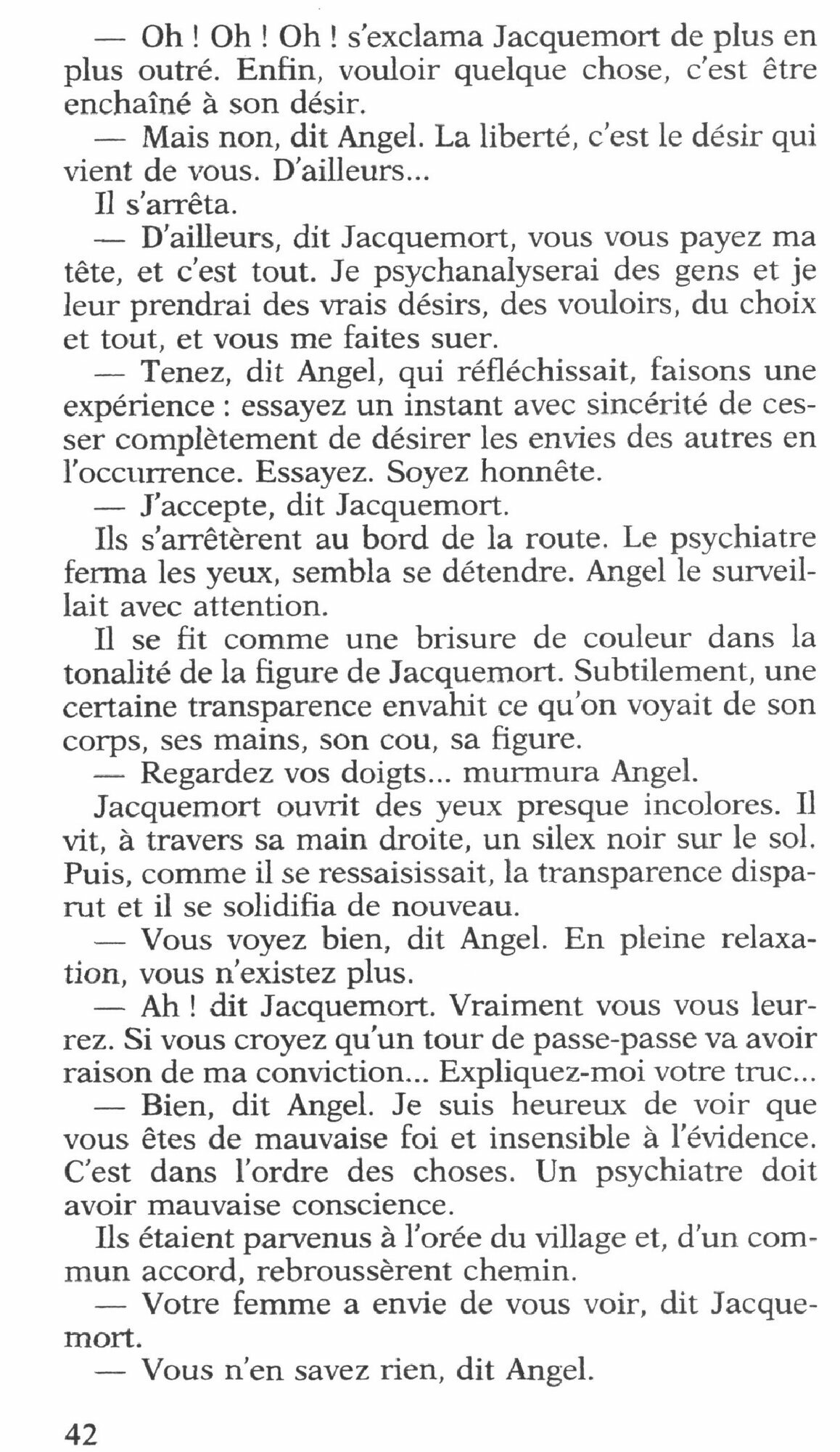 Voila un coin de campagne ou l'on a de droles de facons… La foire aux vieux, par exemple. Curieuse institution ! On sait bien aussi que tous les enfants peuvent voler comme des oiseaux des qu'ils etendent leurs bras- mais est-ce une raison suffisante pour les enfermer derriere des murs de plus en plus hauts, de plus en plus clos ? Le psychiatre Jacquemort se le demande - puis ne se le demande plus, car il a trop a faire avec la honte des autres, qui s'ecoule dans un bien sale ruisseau.