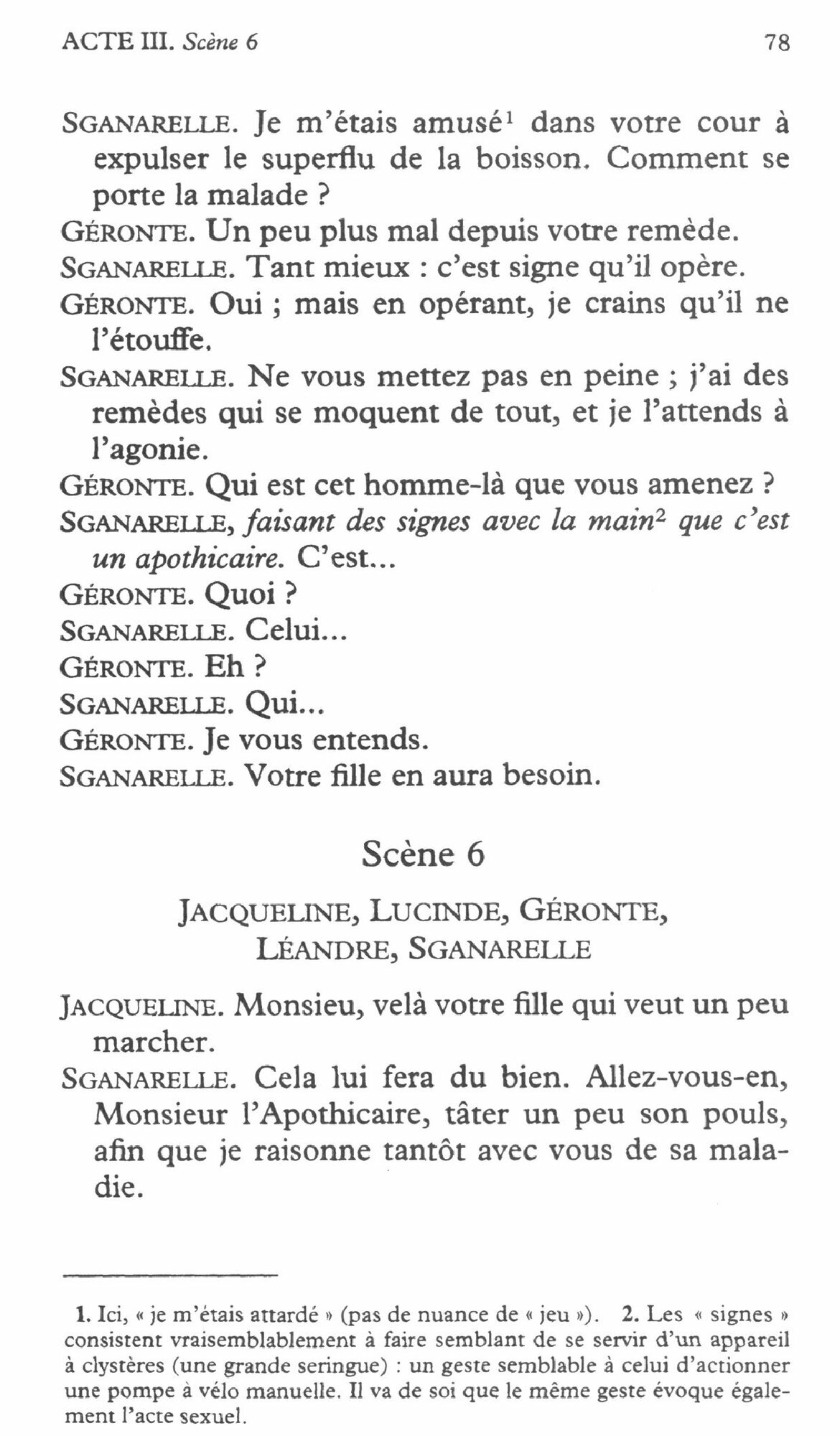 Pour se venger d'avoir ete battue par son mari Sganarelle, Martine le fait passer pour un medecin, mais si fantasque qu'il faut le bastonner pour qu'il accepte d'exercer son art. Contre toute attente, ce medecin malgre lui fait merveille. Au mois d'aout 1666, la piece rencontre un succes eclatant devant le public du Palais-Royal. C'est que Moliere, au sommet de son art, combine avec eclat le vieil heritage de la farce francaise et la lecon de la commedia dell'arte, non sans emprunter a ses propres pieces anterieures. Simple assemblage de sources diverses ? Certainement non, mais une piece construite pour mettre en valeur les exploits de Sganarelle joue par Moliere lui-meme, une piece dont l'allant ne faiblit jamais et ou le genie du dramaturge - acteur, farceur, metteur en scene - n'oublie jamais l'action. Lui-meme nous l'avait dit : « Les comedies ne sont faites que pour etre jouees. »