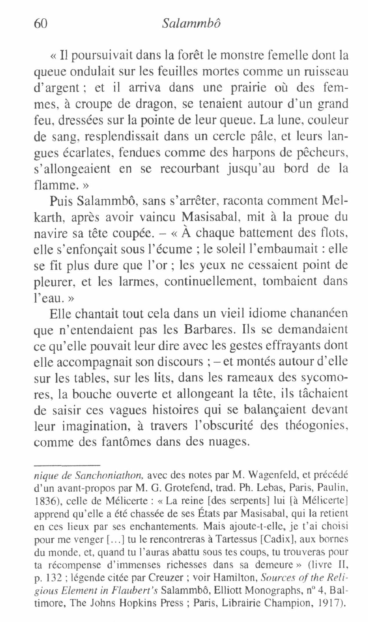 Fille d’Hamilcar et servante de la deesse Tanit, Salammbo donne son nom au roman, et il s’agit bien pour Flaubert de raconter l’amour brut qui l’attache a Matho, le chef des mercenaires employes par Carthage dans sa guerre contre les Romains ; le destin des deux heros est pris dans le tumulte de batailles et de cruautes auquel donne lieu, pres de trois cents ans avant Jesus-Christ, la revolte des mercenaires au retour du combat. En 1856, Madame Bovary avait ete un considerable evenement litteraire. Six ans plus tard, le deuxieme roman de Flaubert, tres attendu, suscita pourtant des reactions contradictoires : beaucoup le jugerent incomprehensible, leste d’une erudition historique excessive, et finalement ennuyeux ; d’autres au contraire s’enthousiasmerent pour son originalite profonde et sa puissance d’evocation. Ce que Salammbo pouvait alors offrir d’etrange ne s’est pas efface, mais l’evidence, s’est imposee d’une beaute jusqu’alors inedite en litterature – la beaute d’une fable ou la violence de l’Histoire se trouve somptueusement mise en scene.