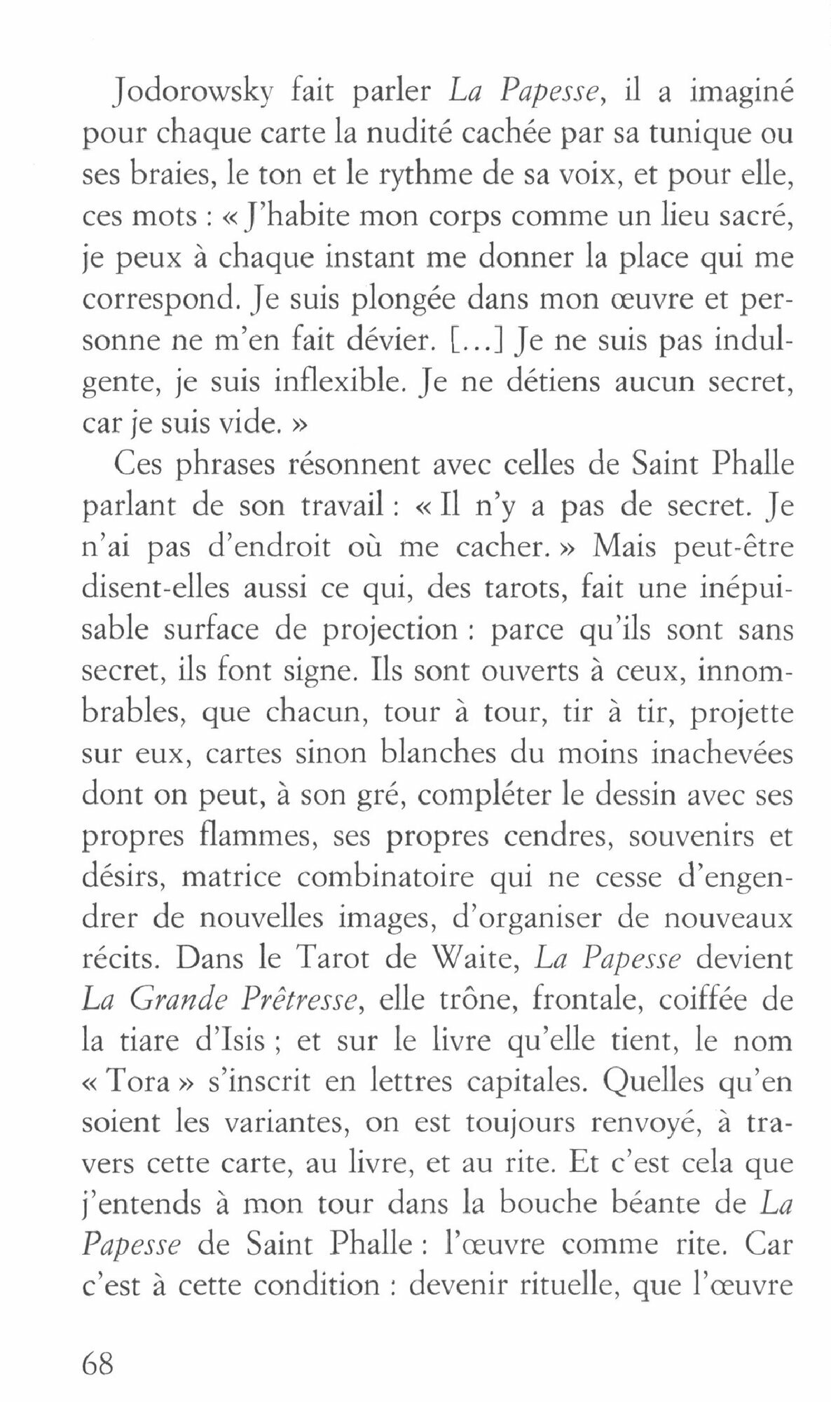 D’une enfance saccagee, Niki de Saint Phalle a extrait une ?uvre triomphale. Elle a peint a la carabine, cree des Accouchees sanglantes et des Mariees livides, des Nanas exultantes et des Black Heroes, des films hallucines. La redecouvrir, c’est partir explorer un ailleurs : le Jardin des Tarots, qu’elle decrivait comme son grand ?uvre, son « destin ». Au fil d’une promenade initiatique, Gwenaelle Aubry joue avec Saint Phalle, tire et rebat ses cartes, piste a la fois la puissance de metamorphose d’une « fille inarretable » et l’enfance fugitive: « Je suis venue te chercher, tu vois, un peu en retard mais je suis la, allez viens, n’aie pas peur, on va au Jardin ».