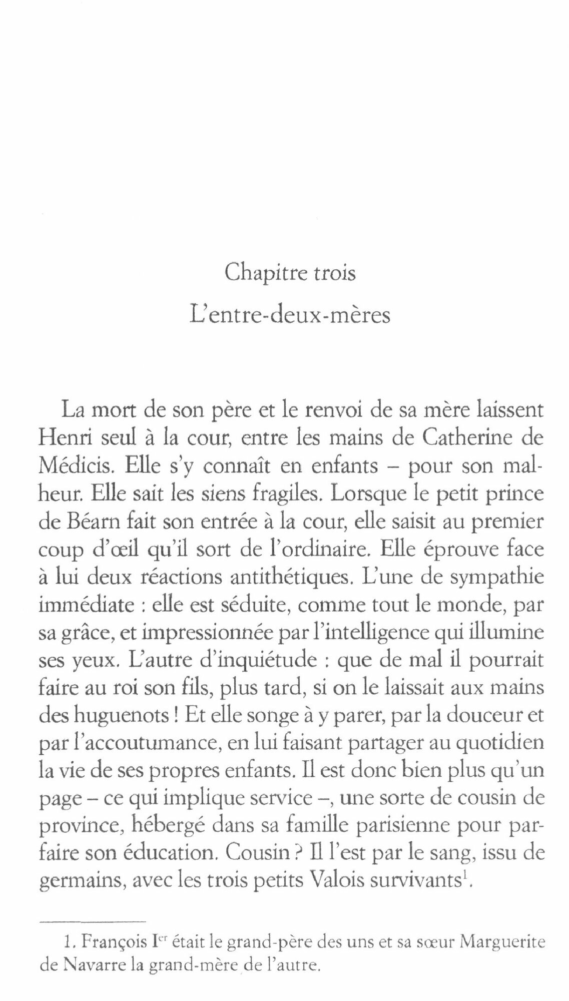 Rien ne predestinait Henri de Navarre a devenir Henri IV, roi de France. Le trone de France etait bien pourvu en heritiers et l’adhesion de Henri a la Reforme le disqualifiait. Il lui fallut pour y parvenir trente ans et une hecatombe. Son itineraire est jonche de morts, par la guerre ou la maladie. Il en emerge les mains pures, sans une egratignure. Une chance ? Pour les chretiens d’alors, tout ce qui advient est du a la Providence, dont ils sont les agents obliges. Henri, d’une intelligence hors pair, se crut voue par elle a une mission : retablir la concorde dans un pays dechire par les guerres de religion.