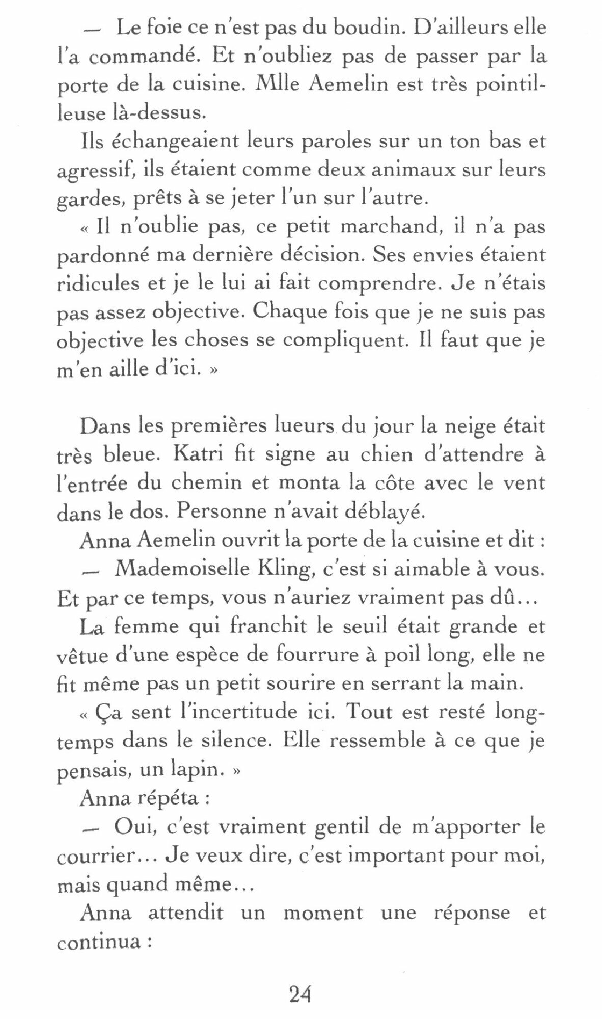 Cet hiver, a Vasterby, la vie est rythmee par la tempete de neige qui n’en finit pas, la construction du chantier naval et l’ouverture de l’unique epicerie du village. Katri semble se satisfaire de son quotidien, qu’elle partage entre son metier de comptable et son frere Mats adore. Jusqu’au jour ou elle rencontre Anna Aemelin, une celebre illustratrice de livres pour enfants decidee a finir ses jours retiree de la societe. Lentement, Katri s’immisce dans sa vie… Mais son devouement est-il sincere ?