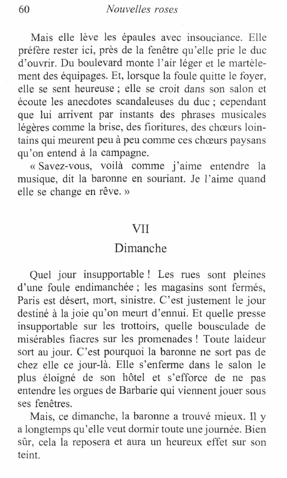 Les Rougon-Macquart ont quelque peu eclipse les autres ?uvres de Zola, et plus encore ses nouvelles. Ecrites pour l’essentiel entre 1875 et 1880, elles ont ete publiees, incompletement et dans un ordre aleatoire, en 1882 et en 1885. Elles valent pourtant la peine d’etre lues a l’egal des romans. Car elles ne sont pas moins revelatrices de l’attention que l’auteur portait au monde contemporain, des pentes de son imaginaire et de sa virtuosite narrative. Henri Mitterand en propose une edition complete dans ce volume et dans celui qui lui fait pendant, intitule Nouvelles noires. Il y adopte un principe inedit : la mise en evidence des alternances de tons que Zola a menagees d’une nouvelle a l’autre. Les Nouvelles roses suivent ainsi une ligne d’insouciance, d’ironie amusee, de serenite retrouvee ou de burlesque aimable. Le volume regroupe, en trois triades, « La semaine d’une Parisienne », « Madame Neigeon », « Nantas » ; « Les Parisiens en villegiature », « Aux champs », « Les coquillages de M.Chabre » ; « Theatre de campagne », « La fete a Coqueville », « Angeline ». Chaque nouvelle fait l’objet d’une etude detaillee de ses conditions de publication, de ses themes et de ses formes.