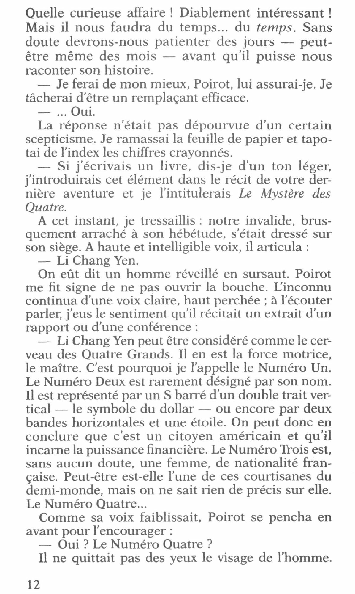 Hercule Poirot semble enfin avoir trouve des adversaires a sa mesure : un quatuor criminel, dont le but n’est rien moins que de s’assurer la domination du monde. Rude bataille en perspective !