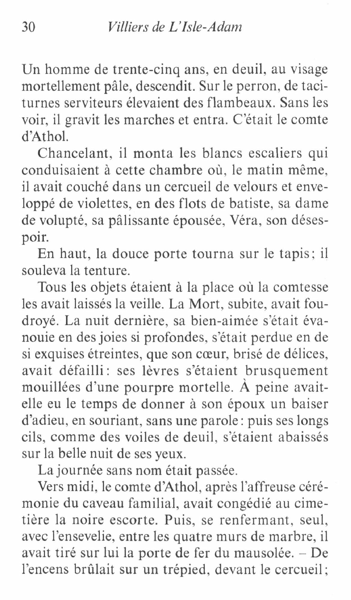 Dans un style d’une limpide purete, Villiers de L’Isle-Adam, le plus illustre des symbolistes, nous entraine avec ses Contes cruels dans le domaine de l’inconscient : Vera vit eternellement dans le souvenir de son amant, L’Inconnue, bien que sourde, entend la voix de l’etre aime… a l’egal d’Edgar Poe, Villiers de L’Isle- Adam mystifie son lecteur tout en se complaisant dans le macabre. Il joue pour notre plaisir avec l’horrible. « Un genie, nous le comprimes tel », a dit de lui Mallarme.