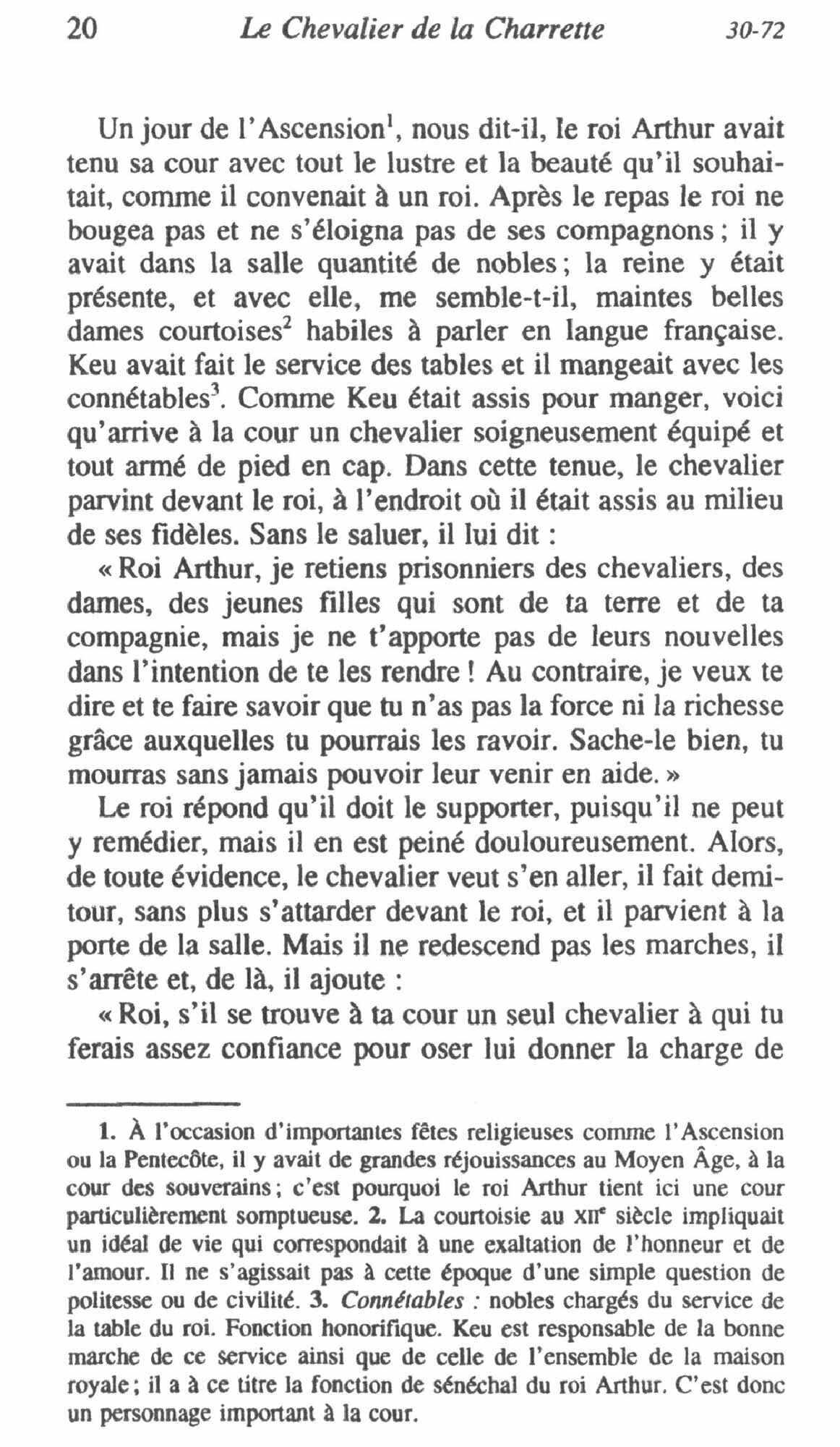 Dans Le Chevalier de la Charrette, Lancelot part delivrer la reine Guenievre, dont il est epris, et que le cruel Meleagant a enlevee. Par amour pour elle, il accepte le deshonneur en montant dans la charrette d’infamie, il resiste aux avances d’une seductrice, il franchit le terrible Pont de l’Epee, il penetre dans un royaume si etrange qu’il est un autre monde. Apres tant d’epreuves, la reine lui reproche d’avoir hesite un instant avant de se deshonorer pour elle. Mais le pardon viendra.
