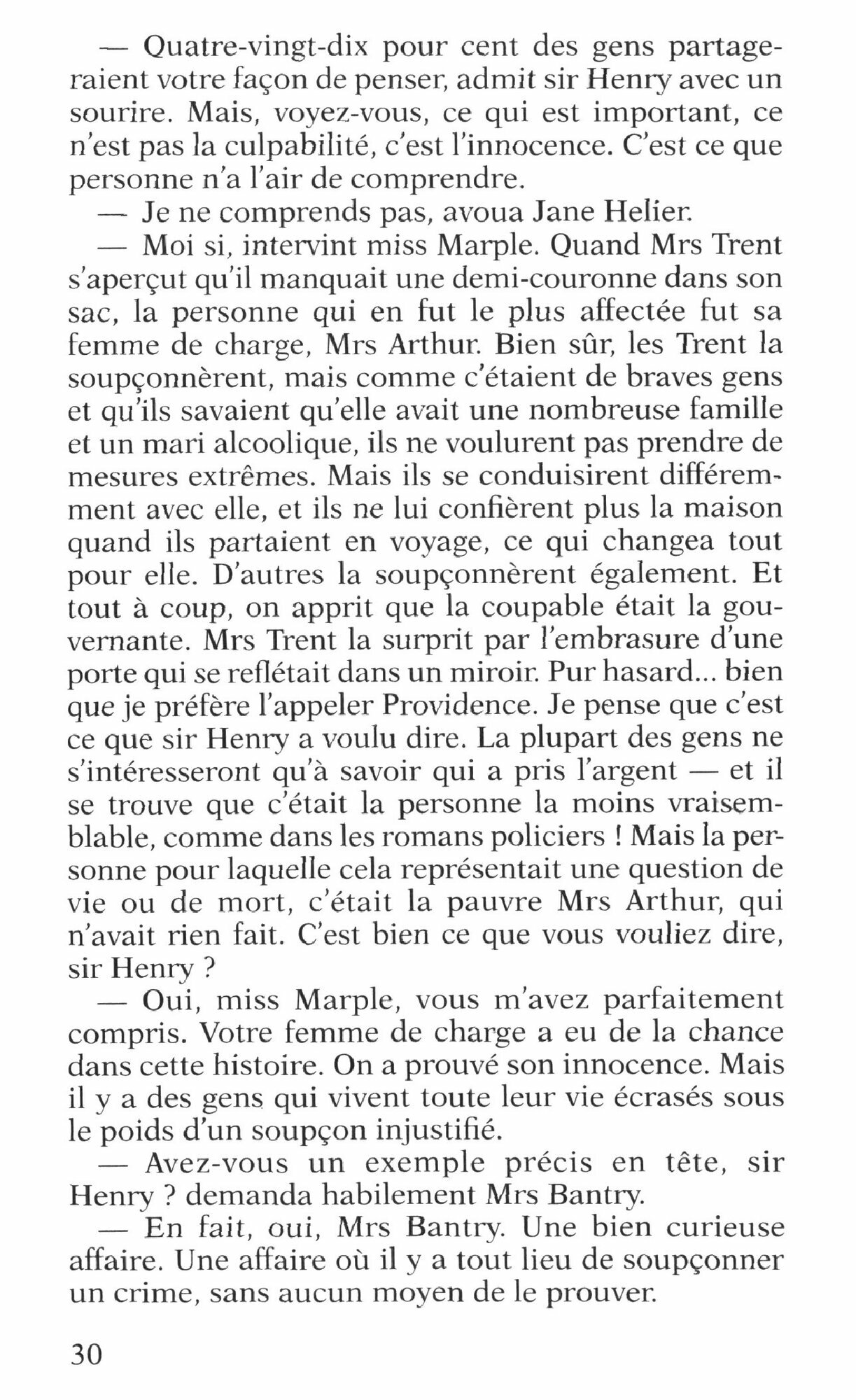 Pourquoi cette dame anglaise comme il faut a-t-elle tue sa demoiselle de compagnie ? Qui a bien pu subtiliser le testament de ce vieux monsieur ? Et si ce n'est pas Mabel qui a empoisonne son mari, alors qui ? Aux petites soirees de Miss Marple, chacun y va d'une histoire etrange dont il a, un jour ou l'autre, ete temoin. Mais, comme dans Miss Marple au club du mardi dont ce recueil de nouvelles est la suite, la vieille demoiselle, impavide dans son fauteuil, denoue les intrigues les plus confuses avec la meme assurance tranquille dont elle fait preuve lorsqu'elle noue les points de son eternel tricot.