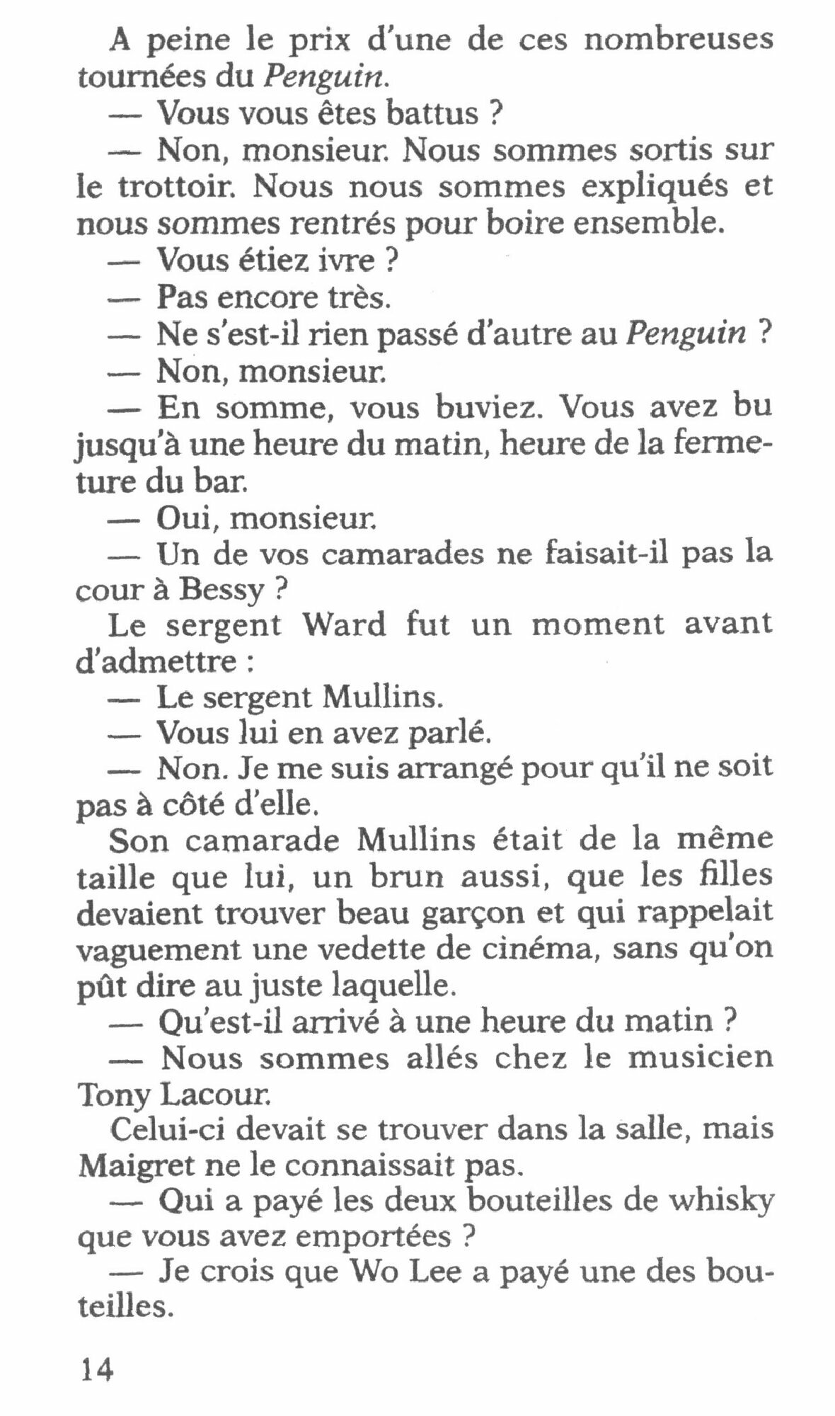 Cette fois-ci, Maigret ne mene pas l'enquete. En mission d'etude aupres de ses collegues du FBI, il n'est que le temoin, souvent surpris, quelquefois reprobateur, des me-thodes americaines en matiere d'investigation criminelle.