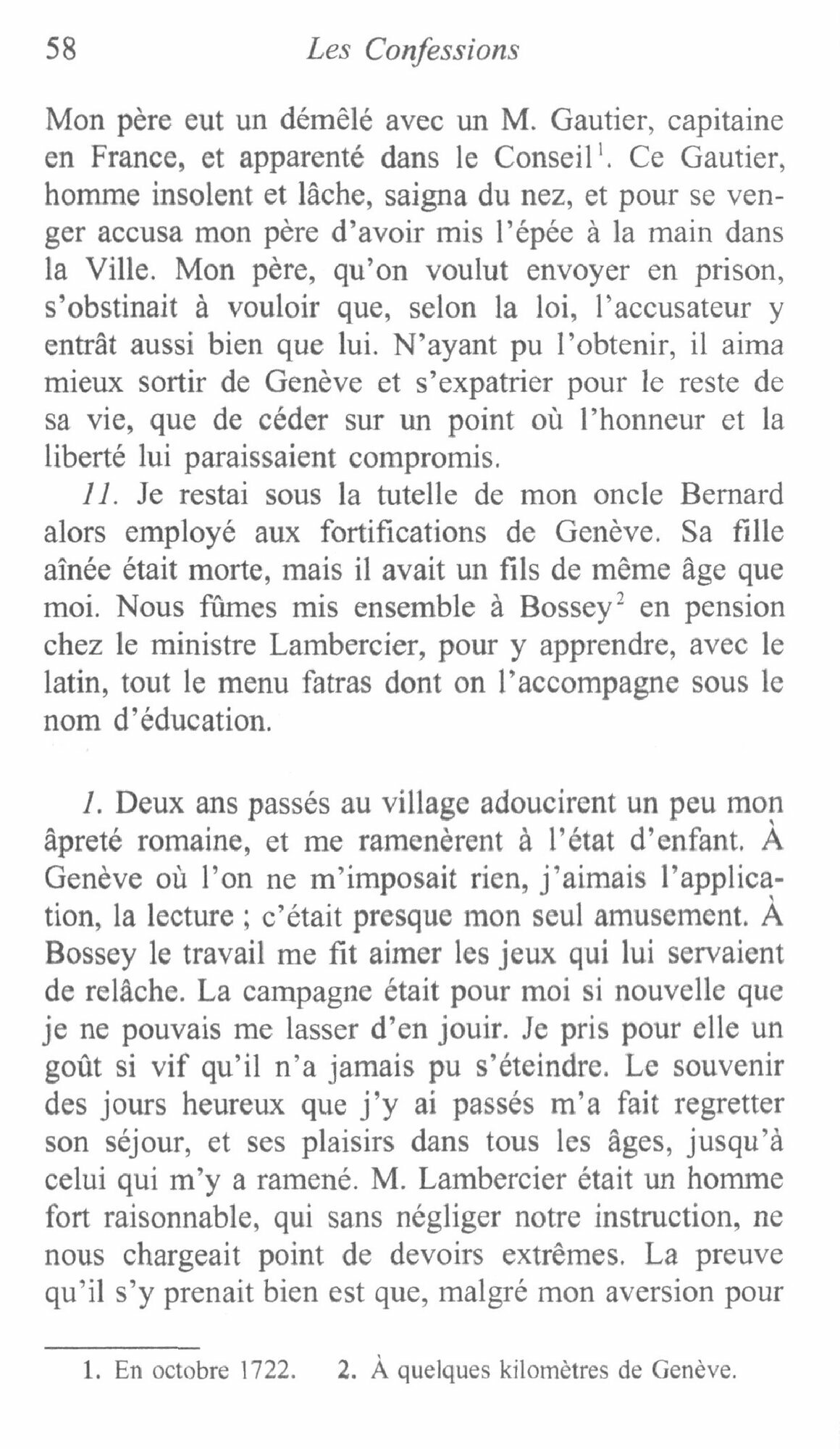 Ces six premiers livres sont le recit de formation du jeune Jean-Jacques, orphelin de mere et fils d’un modeste horloger genevois. Nous retrouvons ici les scenes fameuses que Rousseau a choisies pour nous donner a lire sa nature veritable : la fessee de Mlle Lambercier, le ruban vole, la rencontre avec Mme de Warens, mere et maitresse tout ensemble… D’aveu en aveu, de decouverte en decouverte, l’ecrivain se peint comme il se voit et comme il veut que nous le voyions. Dans Les Confessions, qui paraissent en 1782, quatre ans apres la mort de leur auteur, un territoire tout personnel s’invente ou, a l’ecriture de l’aveu, viennent se meler la fantaisie du romancier, le souvenir des vieux memoires d’aristocrates, sans oublier le gout du siecle pour les romans-memoires : « Je forme une entreprise qui n’eut jamais d’exemple », ecrit Rousseau, et ce qu’il inaugure en effet, c’est un genre litteraire nouveau, celui de l’autobiographie, dont le mot meme n’apparaitra que cinquante ans plus tard.