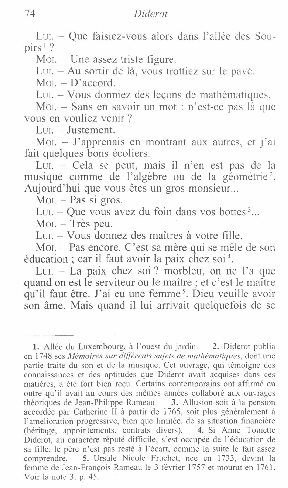Nul n'a porte plus loin que Diderot la maitrise eclatante du dialogue, et c'est la virtuosite de cette parole qu'on retrouve a chacune des pages ici rassemblees : Le Neveu de Rameau, Satire seconde, s'en prend a tous les puissants du moment, financiers aussi bien qu'adversaires de l'Encyclopedie ; la Satire premiere multiplie anecdotes et libres reflexions a la maniere des satiriques antiques. Quant a l'Entretien d'un pere avec ses enfants et a l'Entretien d'un philosophe avec la marechale de ***, ils roulent sur un theme assez bien defini : le premier evoque le danger de se mettre au-dessus des lois, et le second fait entendre, en contrepoint de la conversation avec la devote marechale de Broglie, quelque chose des entretiens de Diderot avec la tsarine Catherine II. En depit de leur diversite, tous ces textes se repondent. Mais ils sont en meme temps tournes vers le lecteur, un lecteur trop seduit par le philosophe pour ne pas comprendre l'indulgence du pere a l'egard de son fils rebelle : «Je ne serais pas trop fache qu'il y eut dans la ville un ou deux citoyens comme toi ; mais je n'y habiterais pas s'ils pensaient tous de meme.»