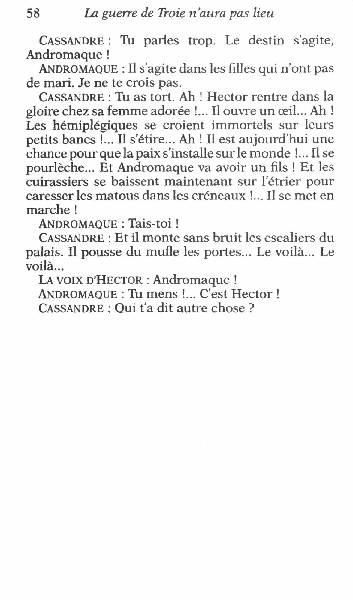 Paris n'aime plus Helene et Helene a perdu le gout de Paris, mais Troie ne rendra pas la captive car pour tous les hommes de la ville «il n'y a plus que le pas d'Helene, la coudee d'Helene, la portee du regard ou de la voix d'Helene », et les augures eux-memes refusent de la laisser partir.